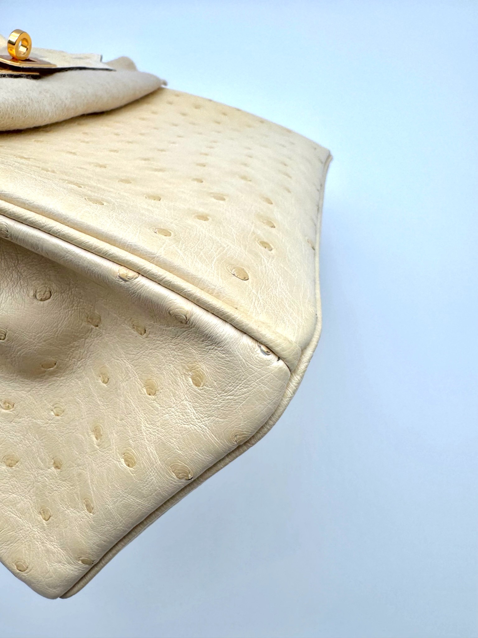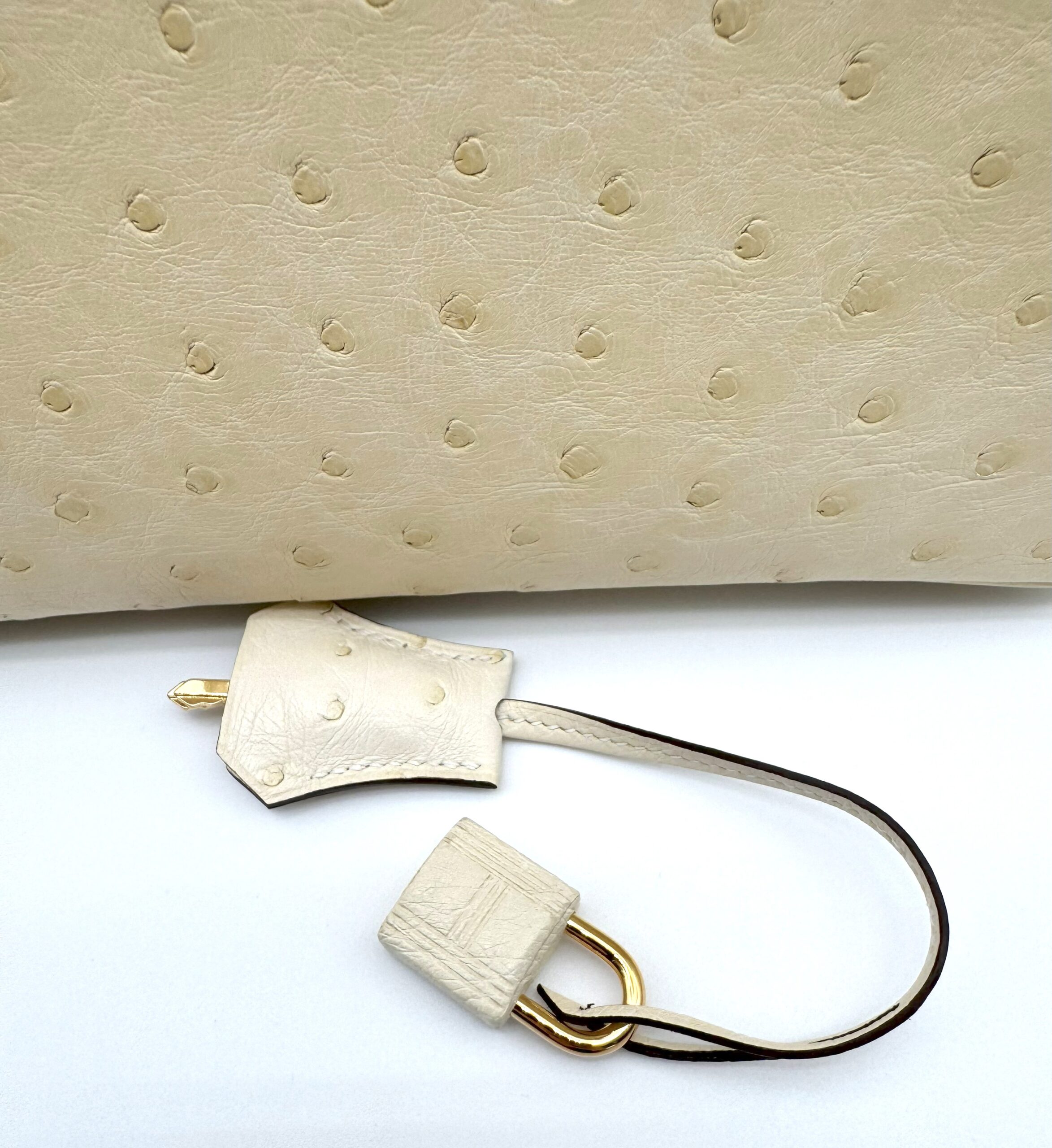 An elegant Hermes bag that is beautifully handcrafted in rare ostrich leather and features rolled leather top handles with yellow gold hardware. The bag opens to a goatskin leather interior with zipper and pockets.