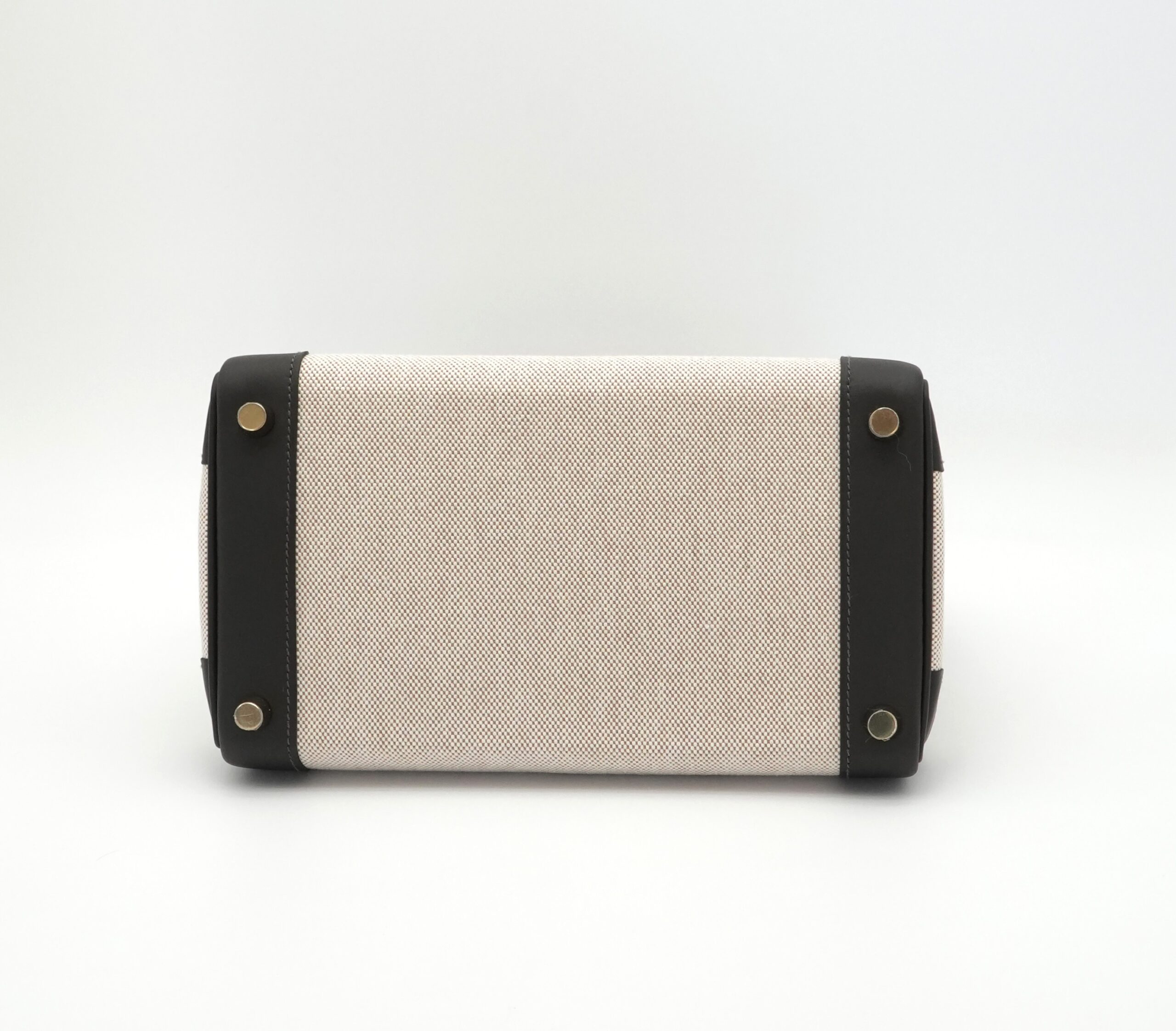 A classic Hermes bag that is beautifully handcrafted in swift calfskin leather with canvas and features rolled leather top handles with rose gold hardware. The bag opens to a goatskin leather interior with zipper and pockets.