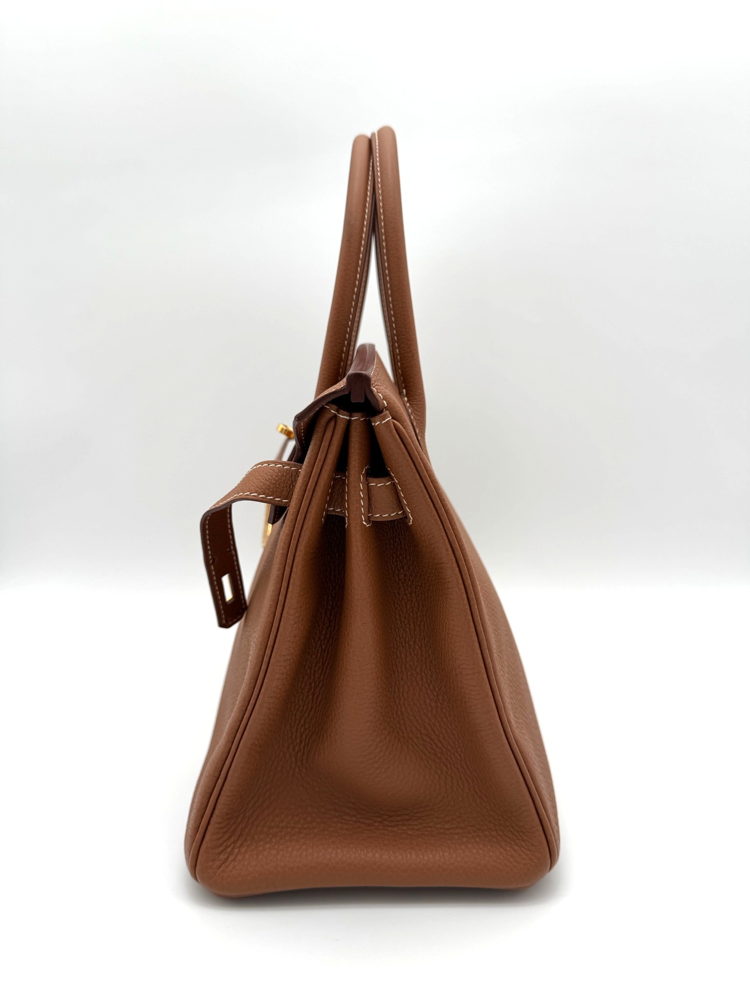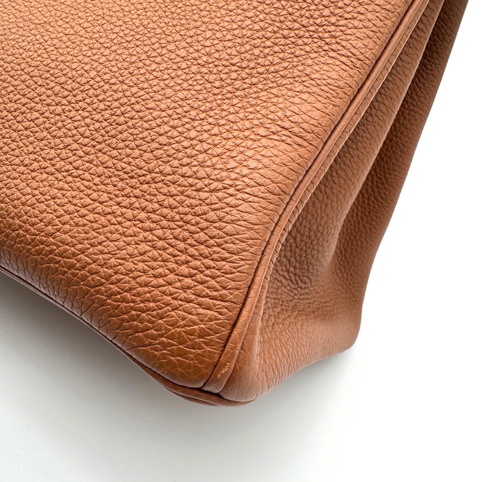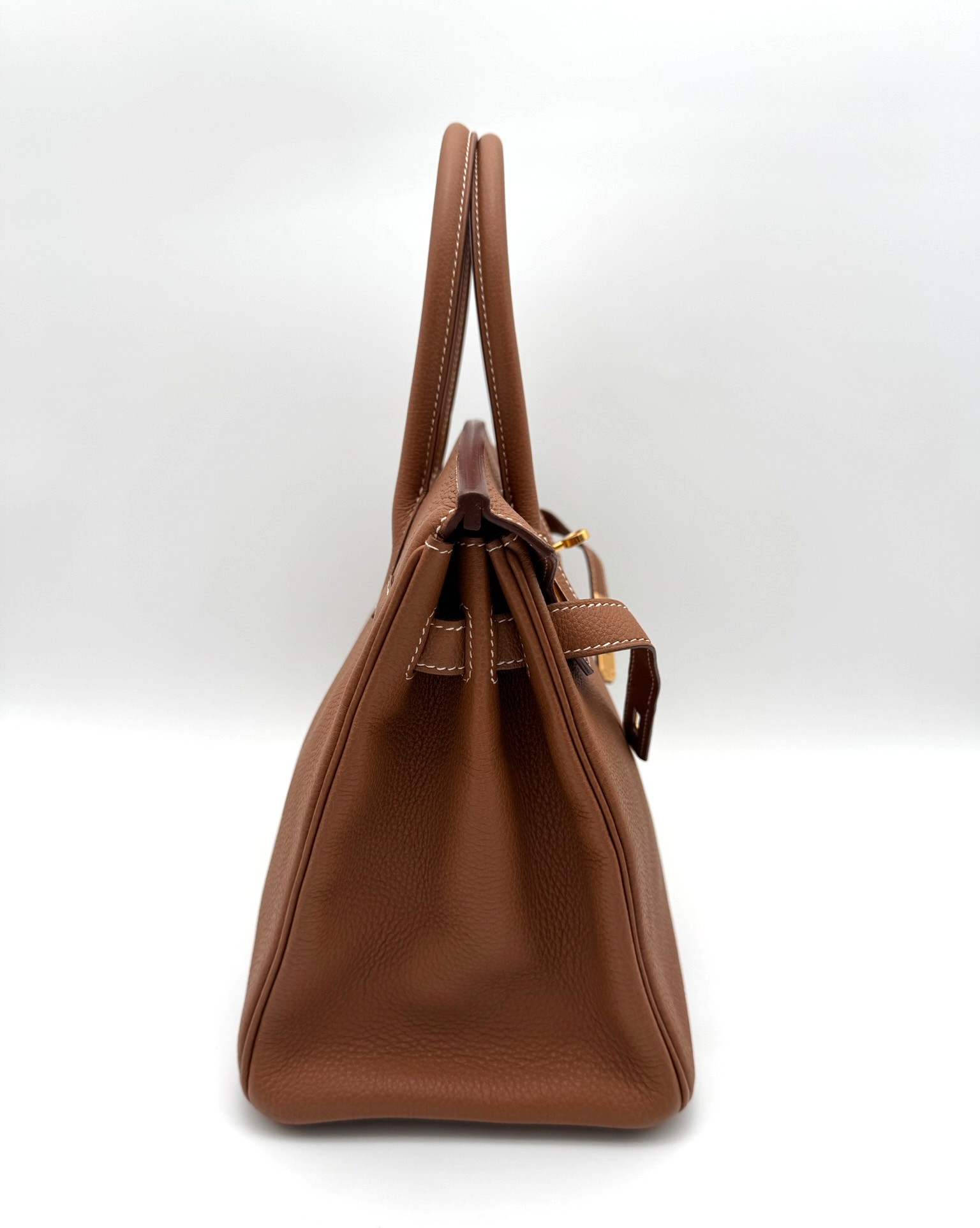 A classic Hermes bag that is beautifully handcrafted in Togo calfskin leather and features rolled leather top handles with yellow gold hardware. The bag opens to a goatskin leather interior with zipper and pockets.