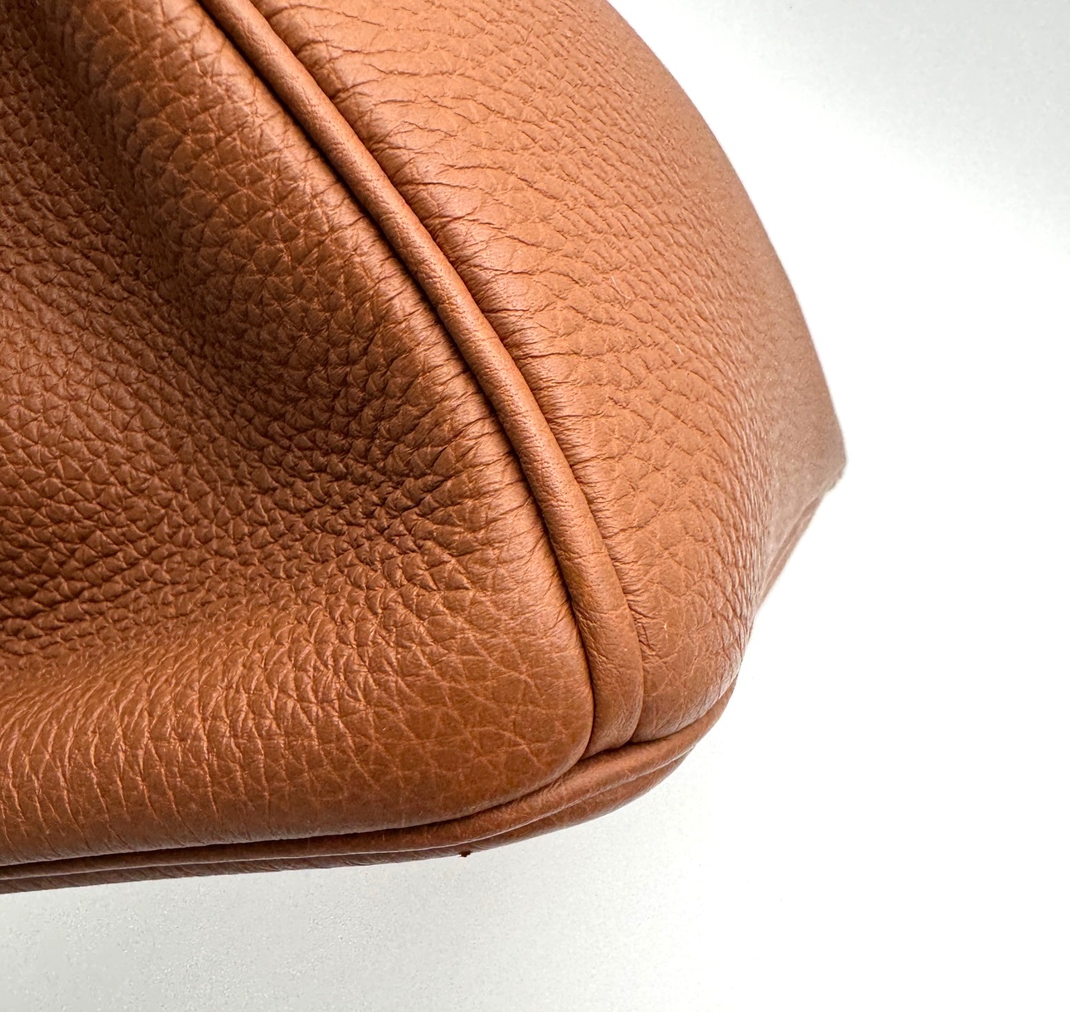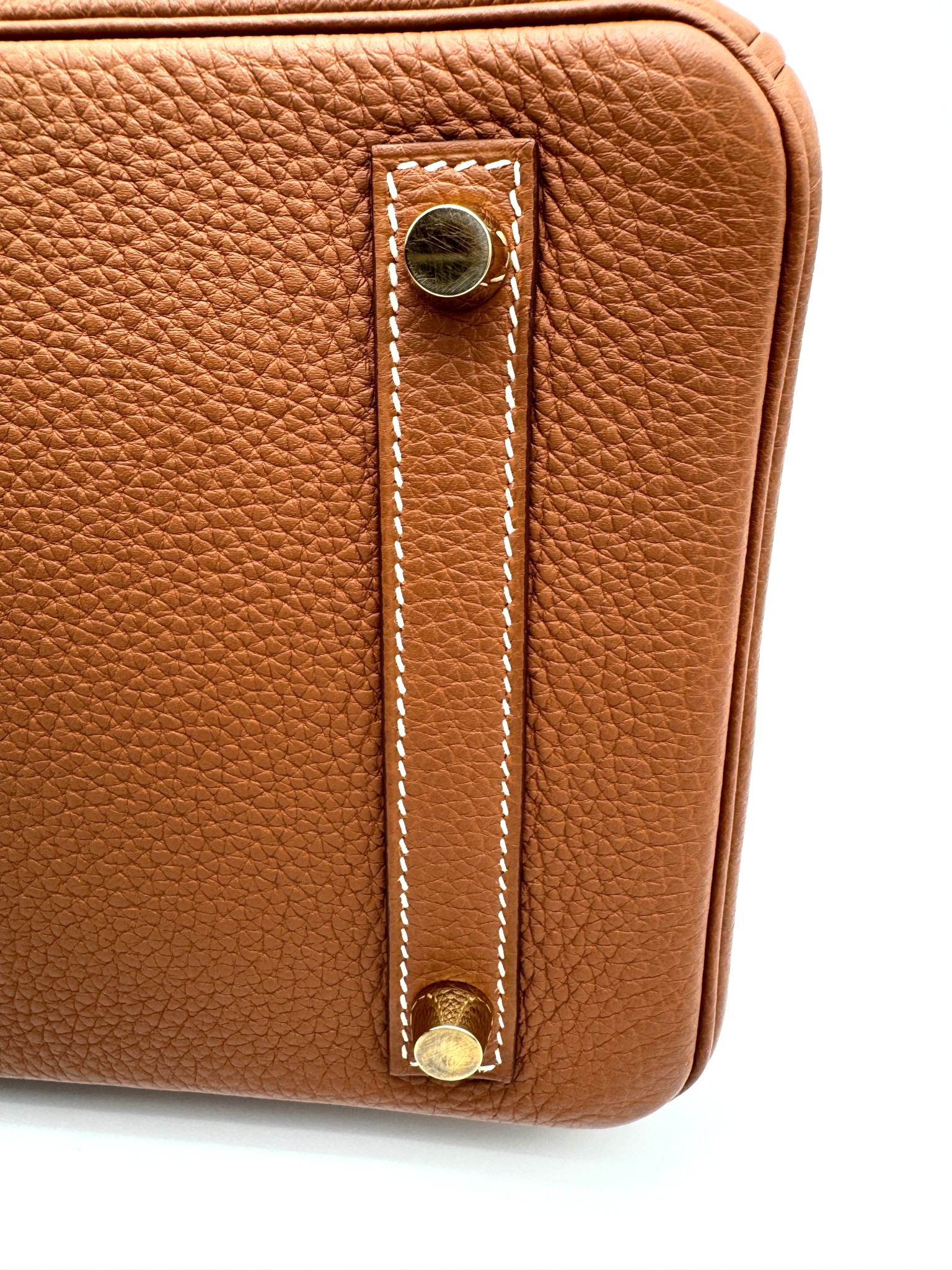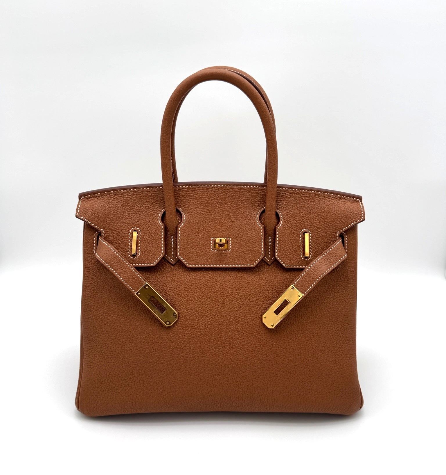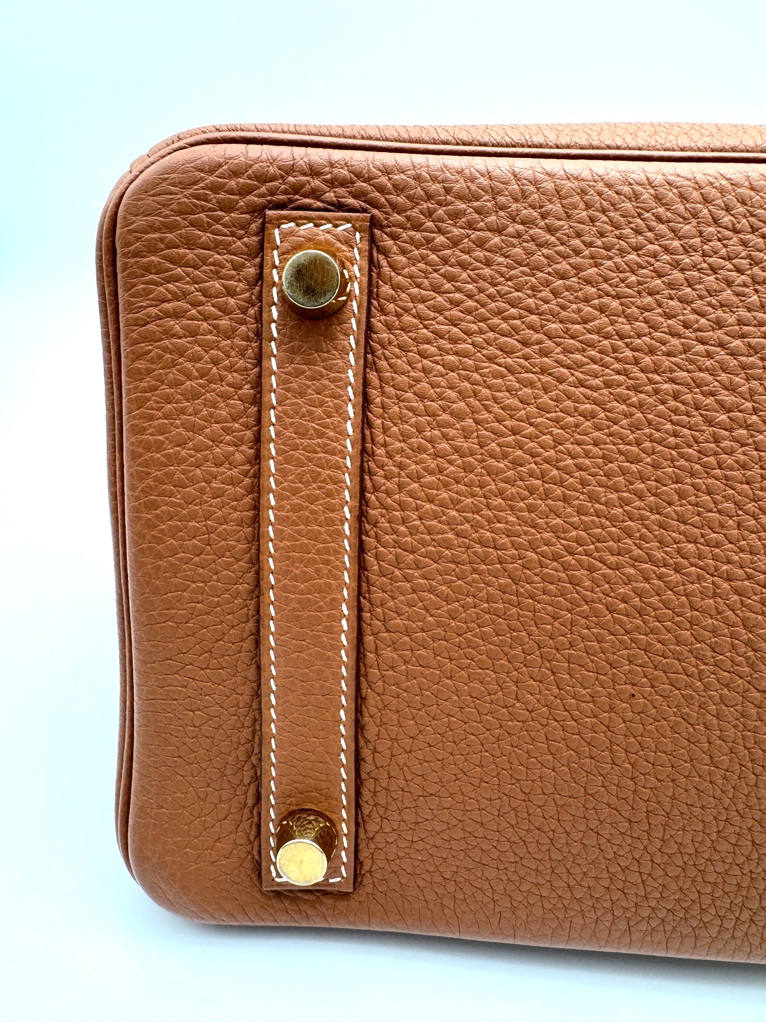 A classic Hermes bag that is beautifully handcrafted in Togo calfskin leather and features rolled leather top handles with yellow gold hardware. The bag opens to a goatskin leather interior with zipper and pockets.