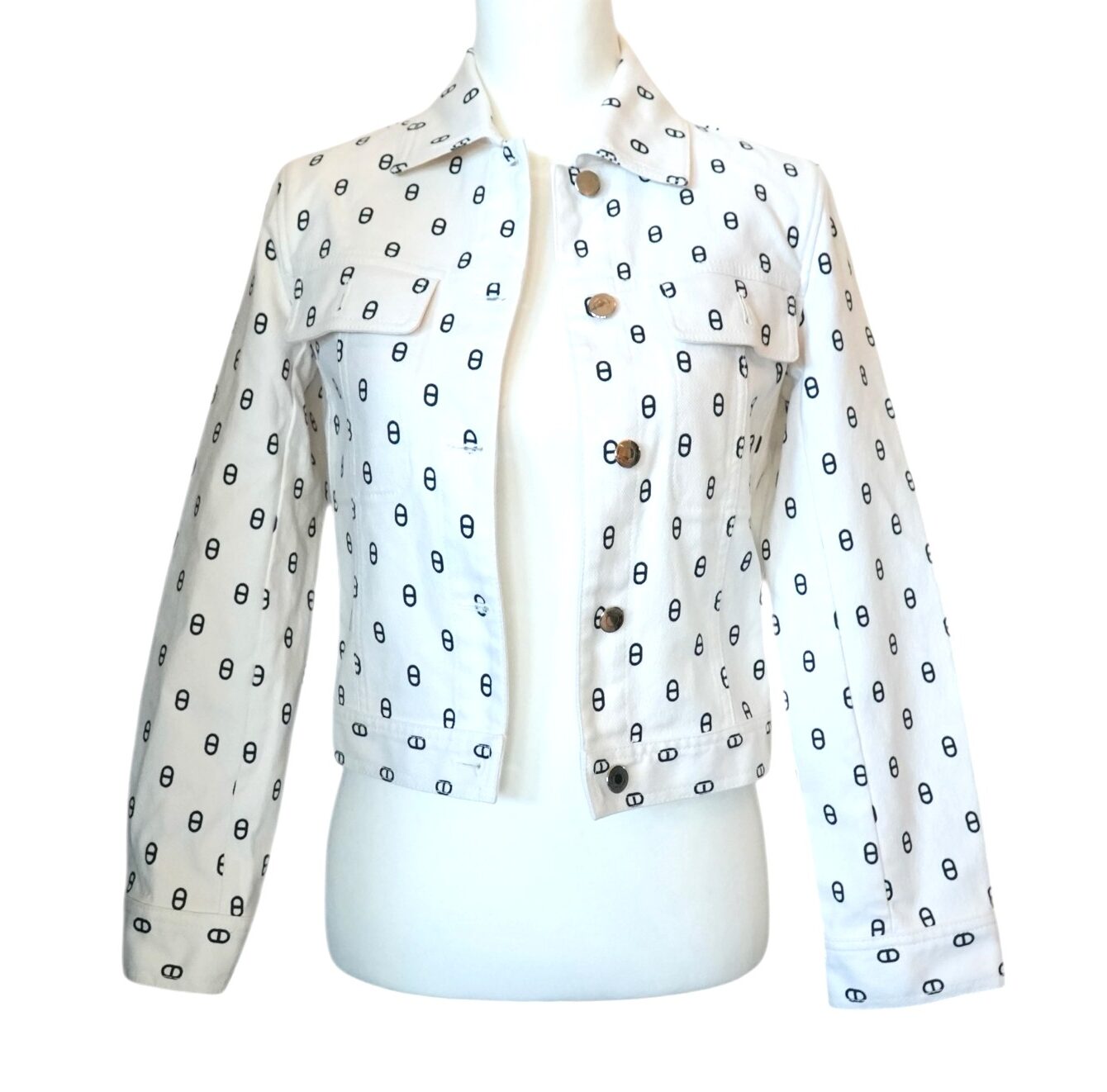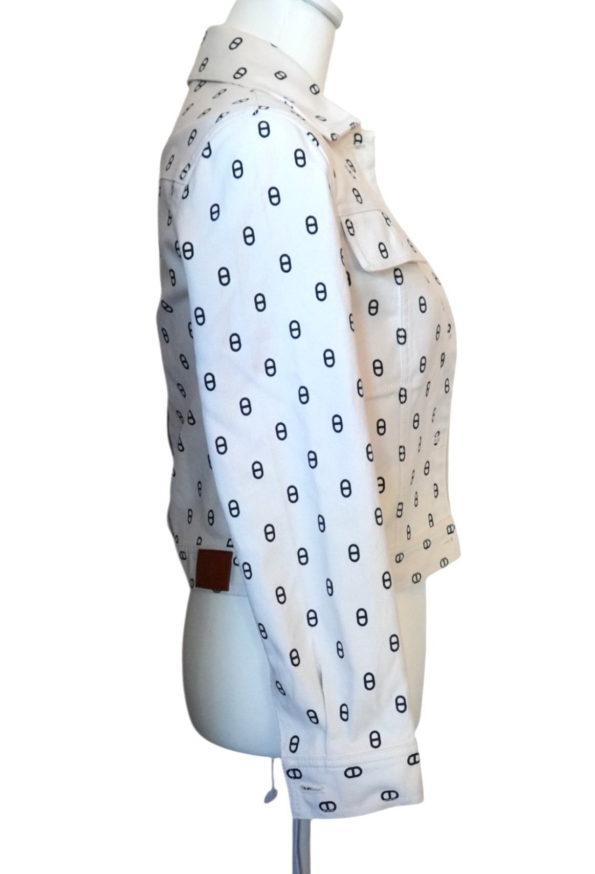 Chic and easy to wear, this cropped denim jacket features the iconic Hermes Chaine d’Ancre pattern all over.