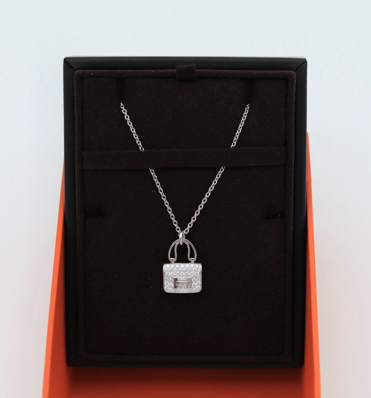 A classic necklace in white gold set with diamonds. This reinvented Constance leather good effortlessly brings to life a stunning and charming fine jewelry piece.