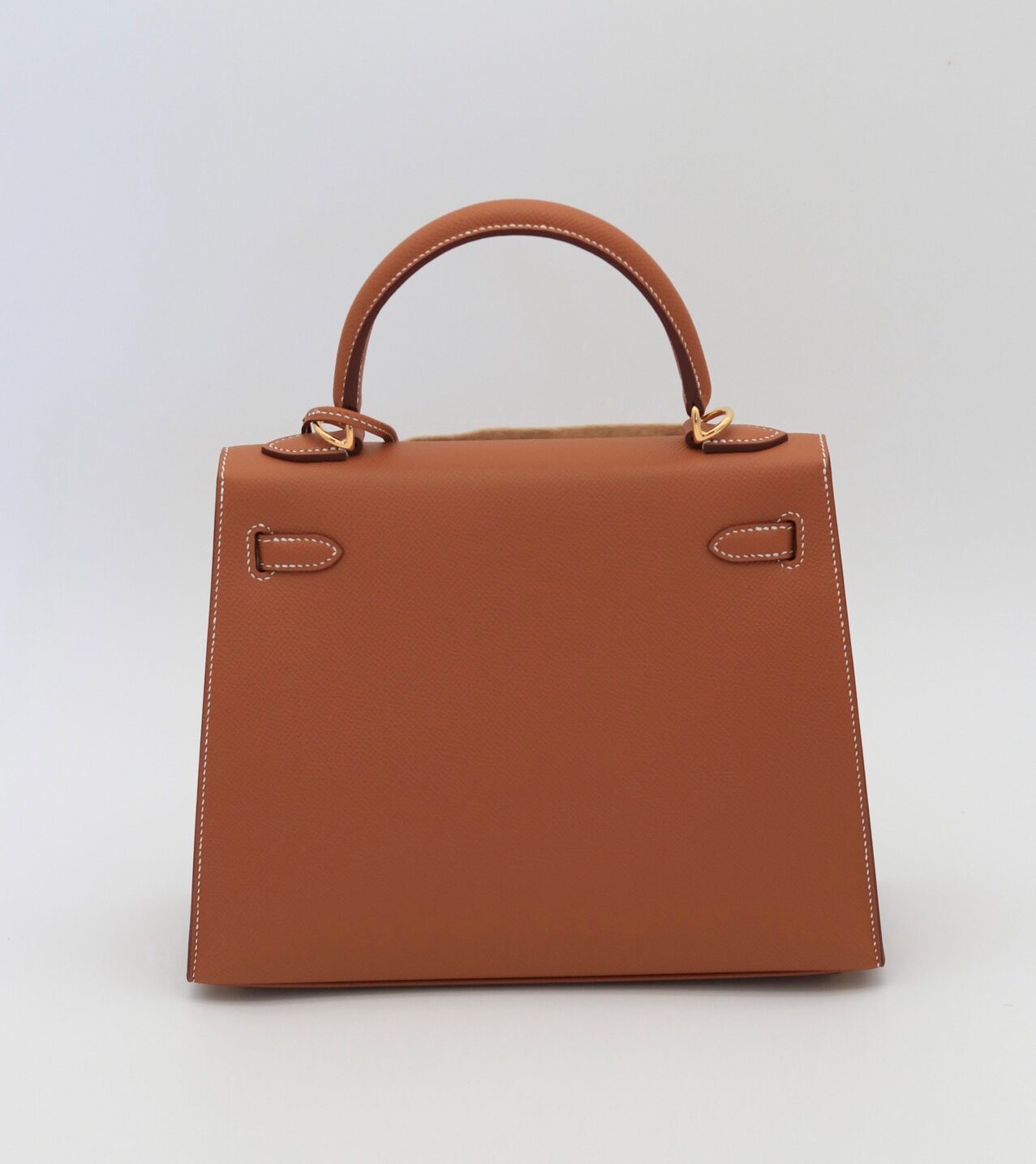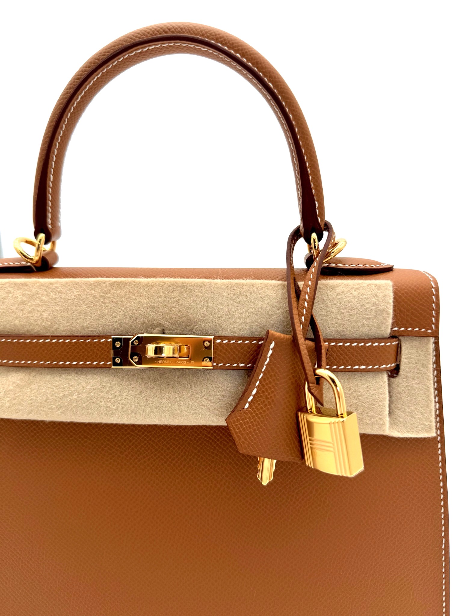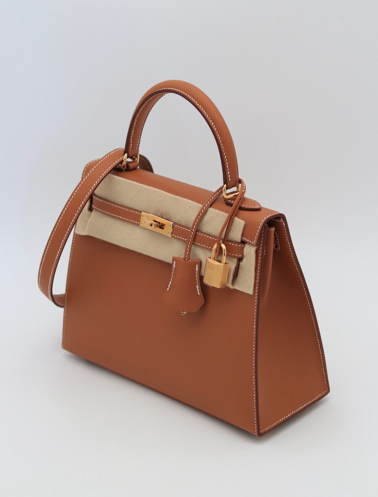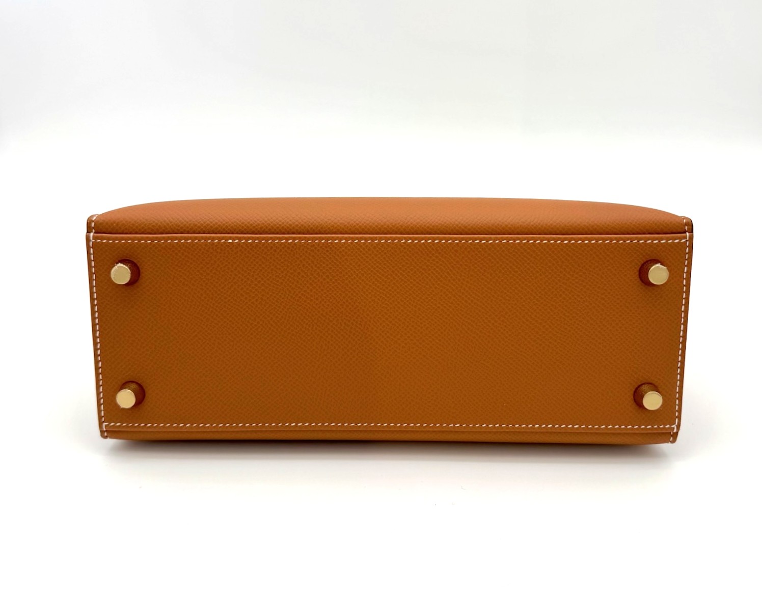 A classic Hermes bag that is beautifully handcrafted in Epsom calfskin leather and features a single rolled leather top handle with yellow gold hardware. It also has a removable leather shoulder strap. The bag opens to a goatskin leather interior with zipper and pockets.