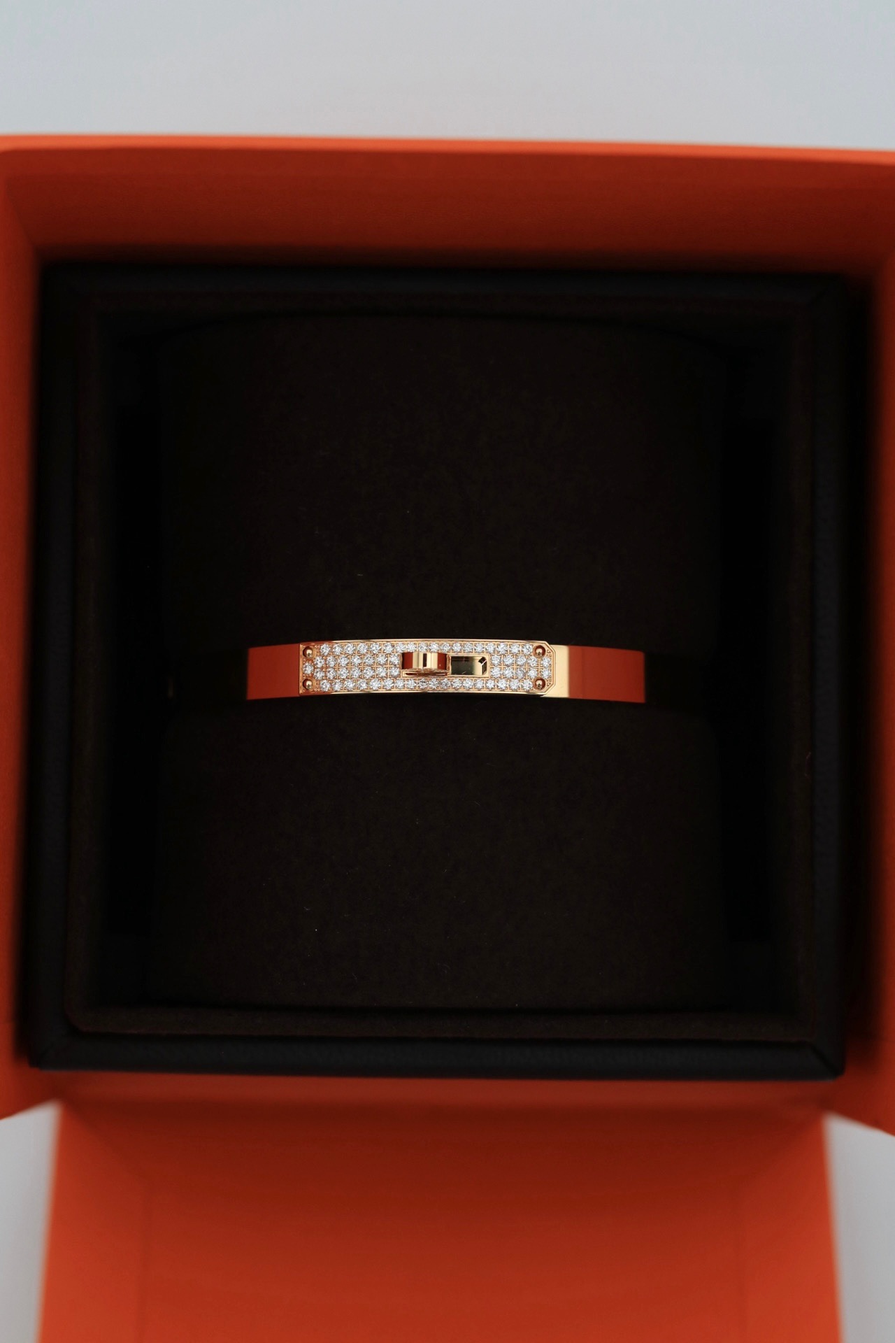Elegant and timeless bracelet in rose gold set with diamonds. Hermes iconic bag with its turn clasp reinvented as a signature piece of jewelry.