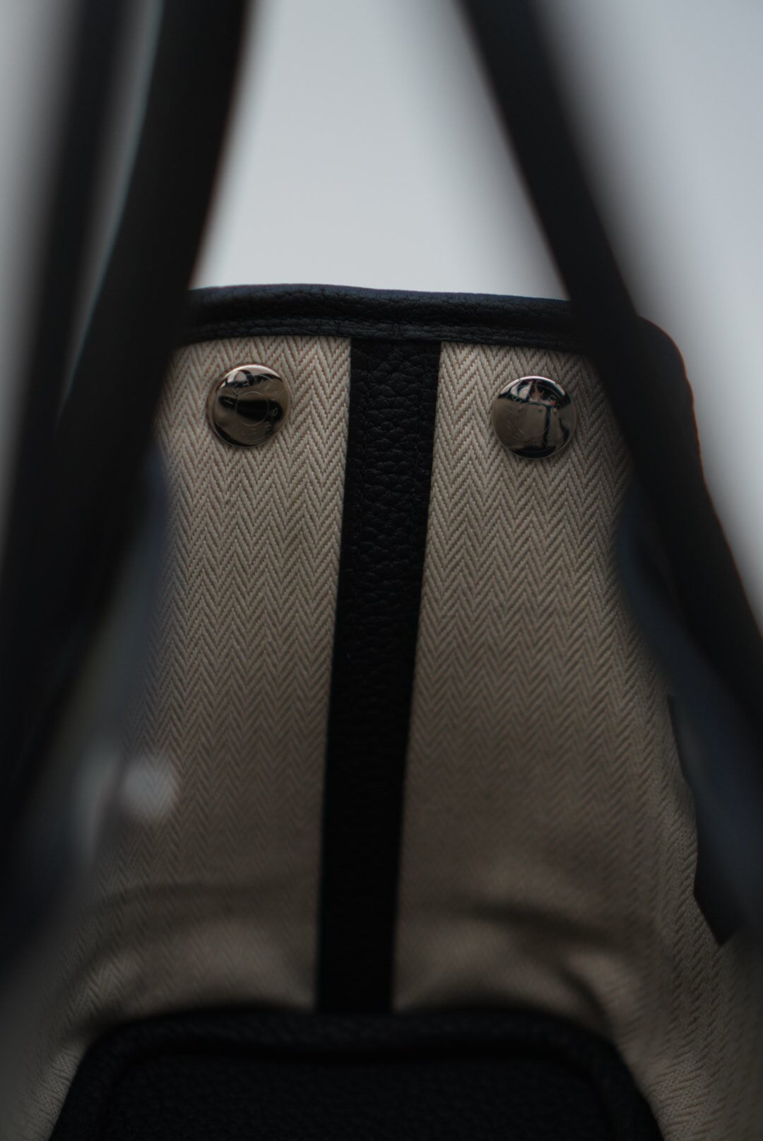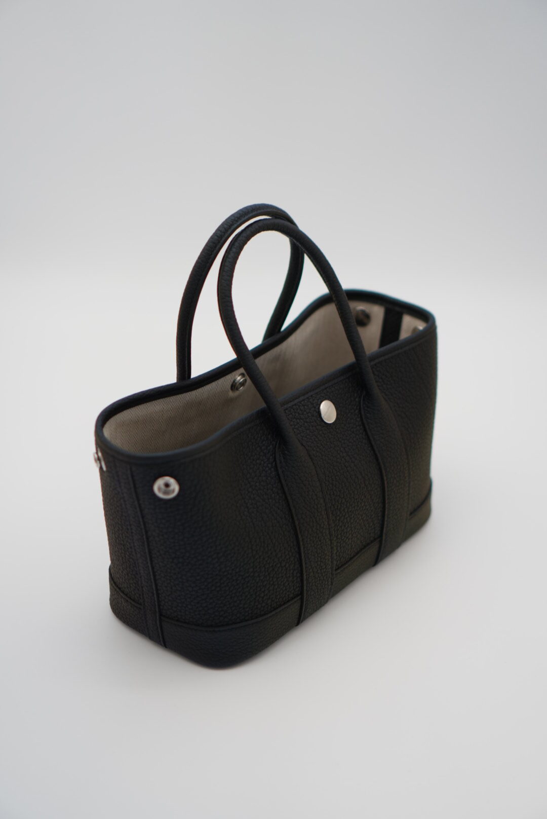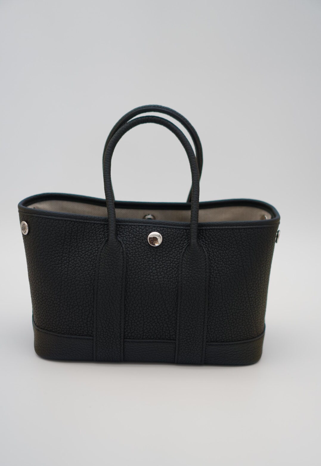 A versatile and functional, this adorable tote is the most popular size Garden Party.  The tote features rolled leather top handles and expandable sides.  The open top opens to a herringbone fabric interior with a zip pocket.
