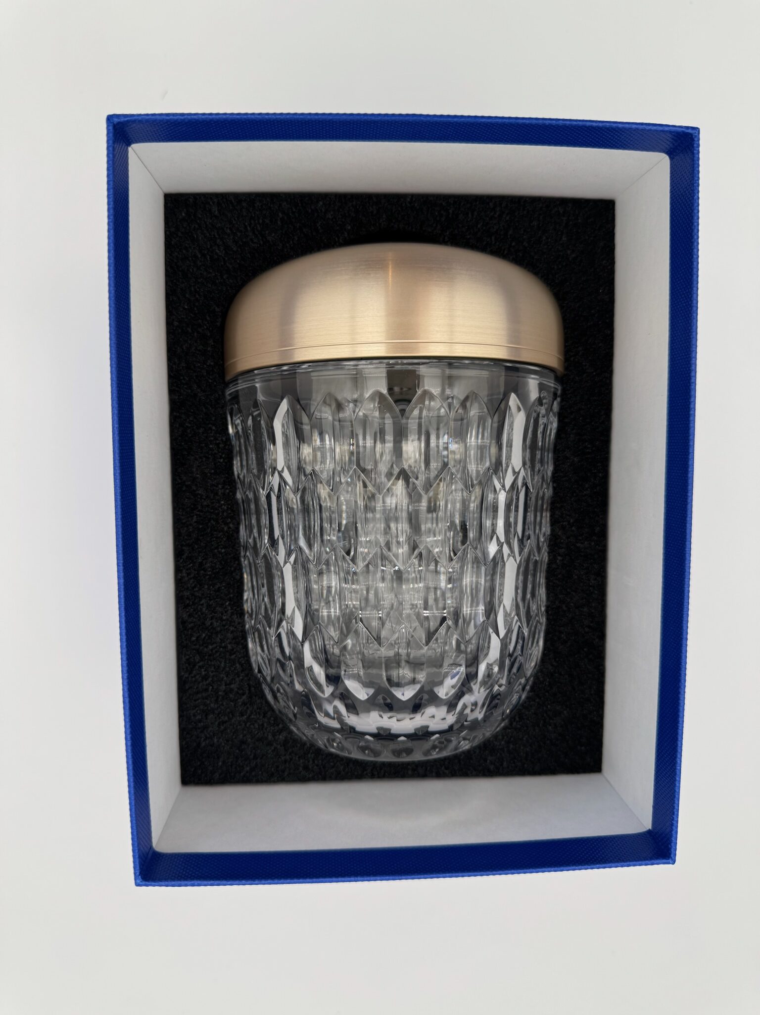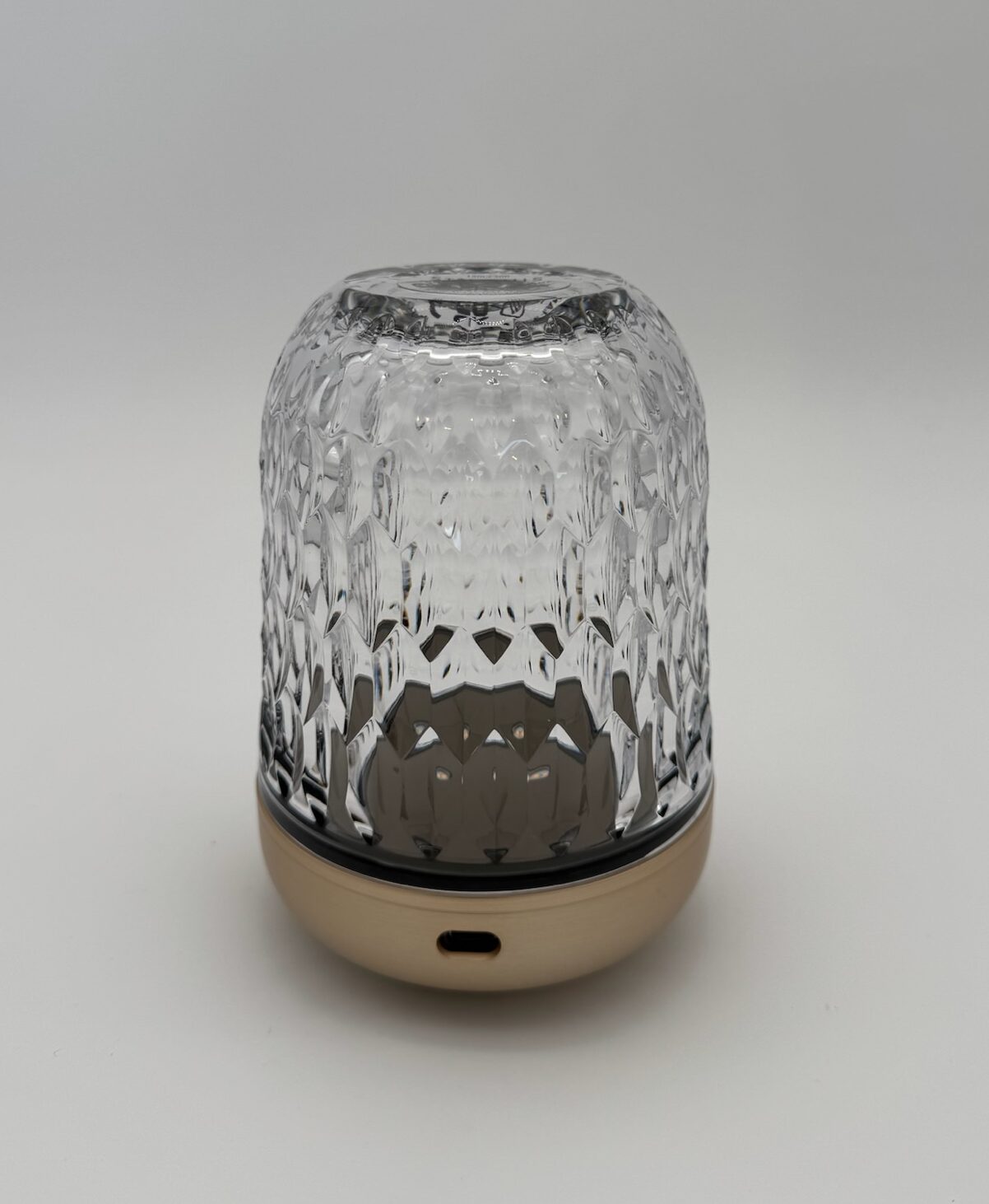 Mini portable lamp features beveled crystal accents. Rechargeable with two adjustable light temperatures and three intensity levels. Illuminate your style and sophistication with this enchanting décor piece.
