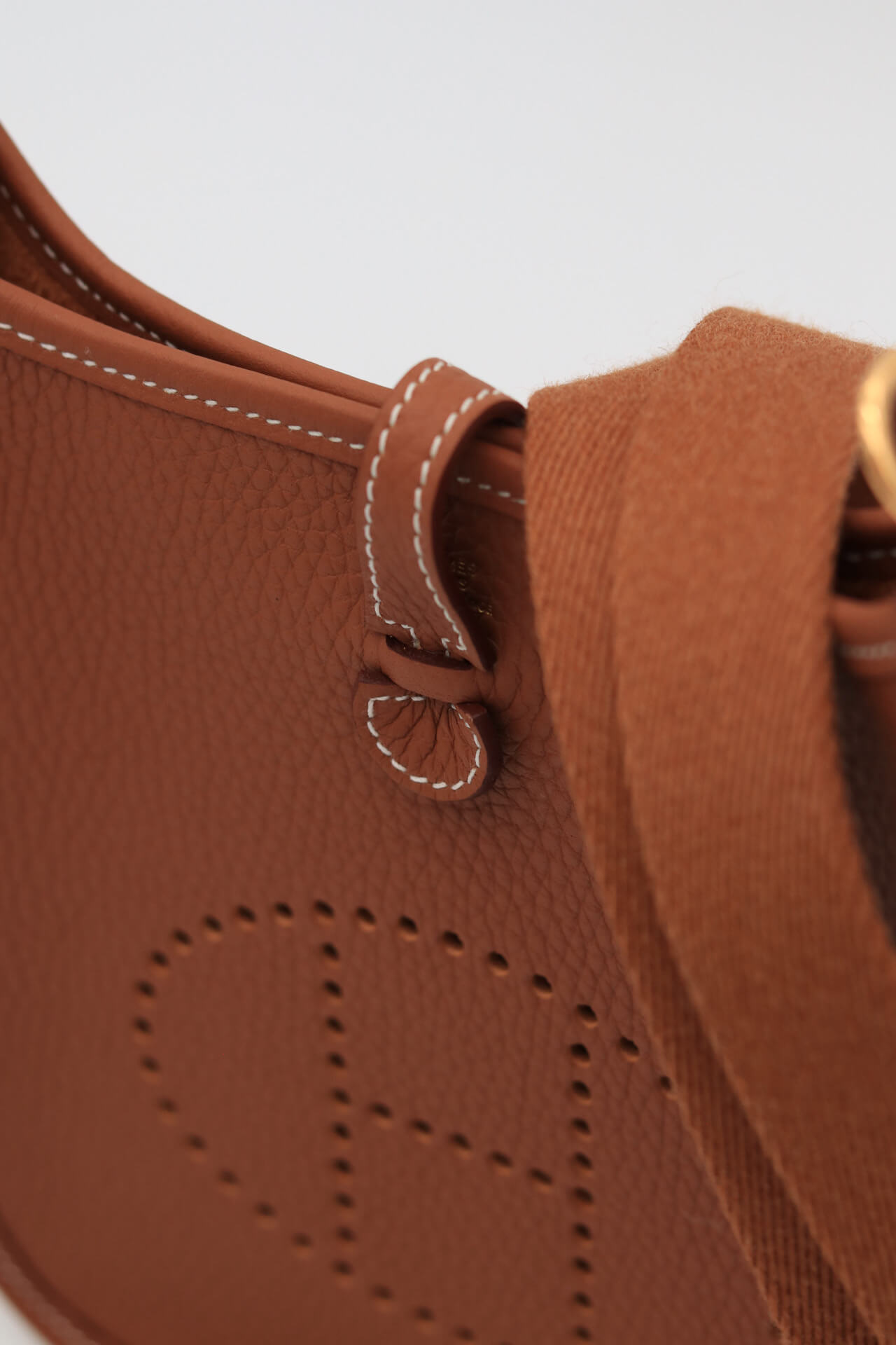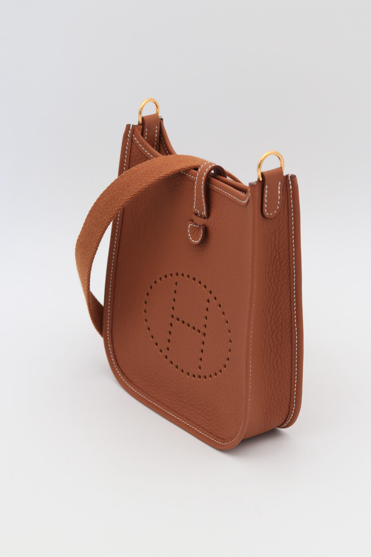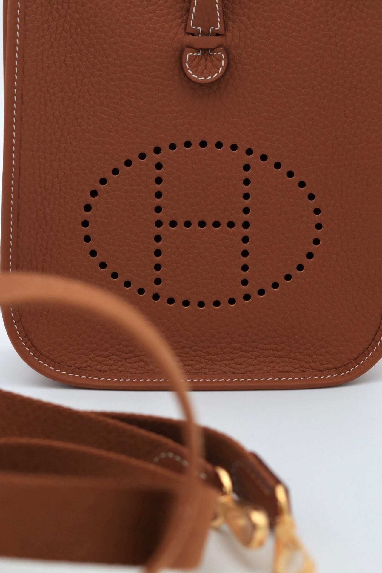 The Evelyne TPM is a petite crossbody messenger bag that is practical and casual, perfect for carrying essentials such as phone, wallet and keys. The bag features an Amazone canvas strap and palladium hardware with a perforated H inside an oval on the front of the bag.