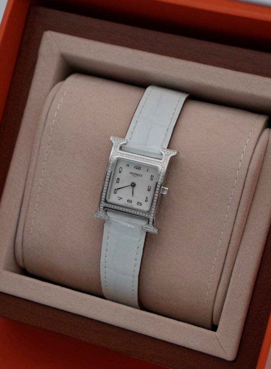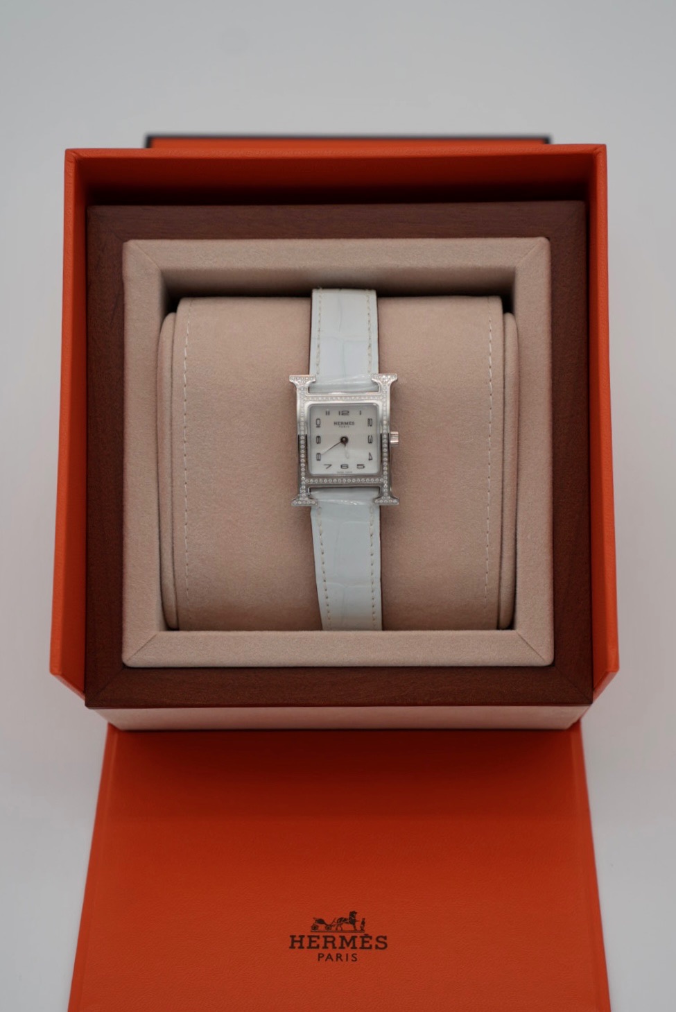 Timeless diamond-set steel “H” quartz watch with white mother-of-pearl dial and interchangeable matte alligator strap.