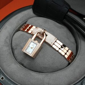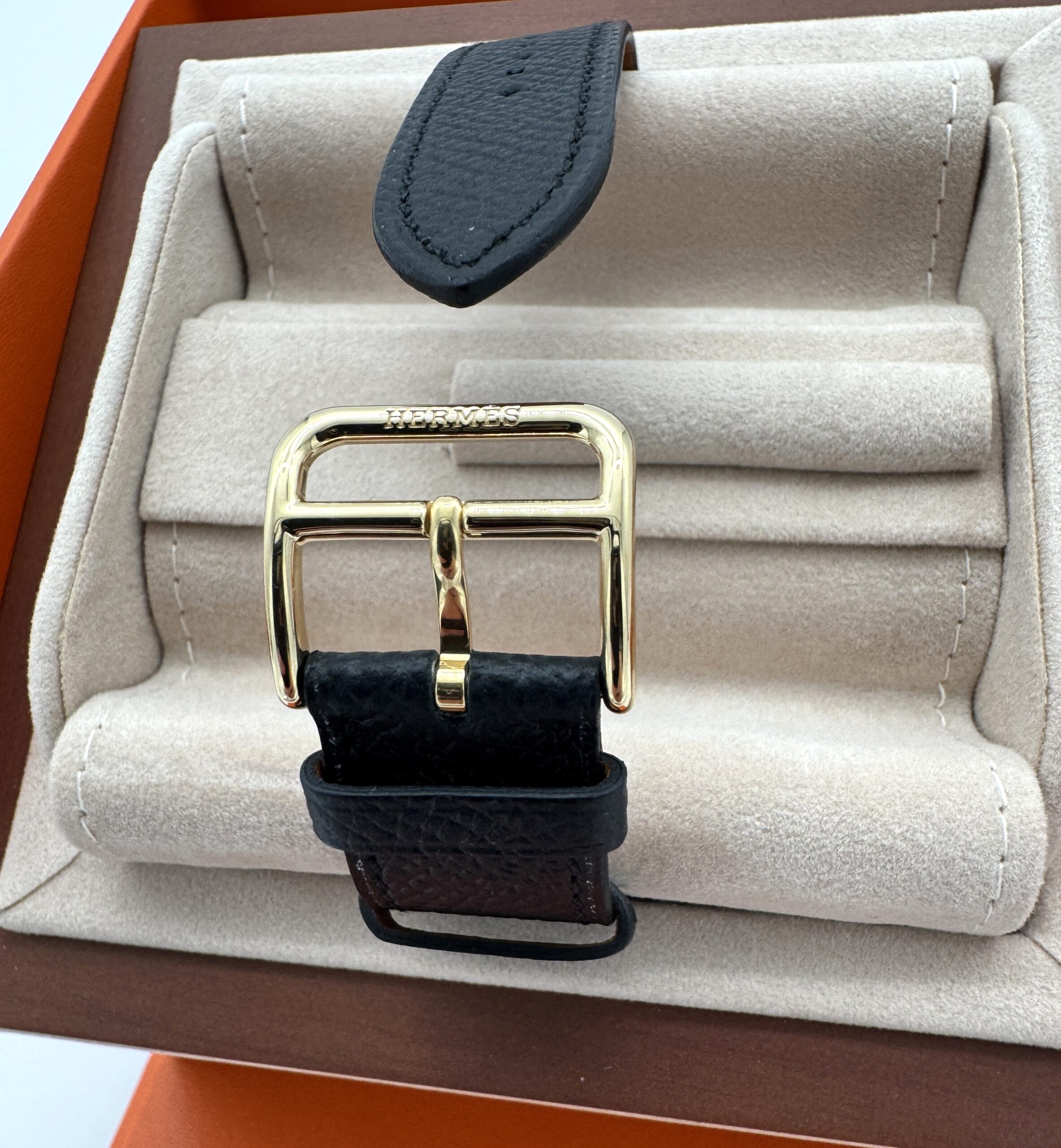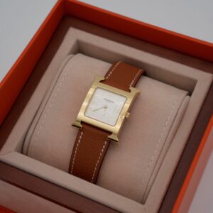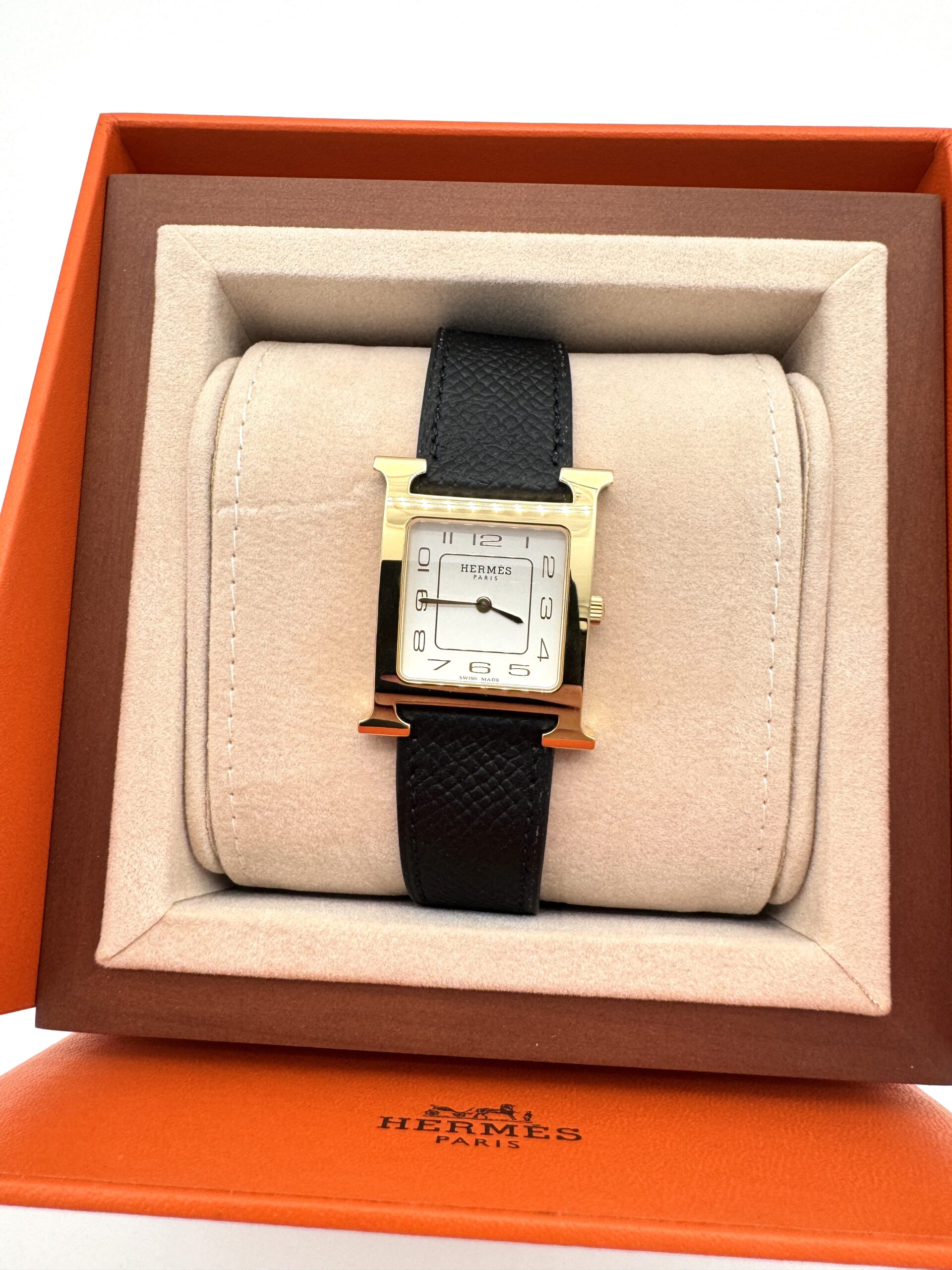 Timeless yellow gold-plated steel “H” quartz watch with Epsom interchangeable calfskin strap.