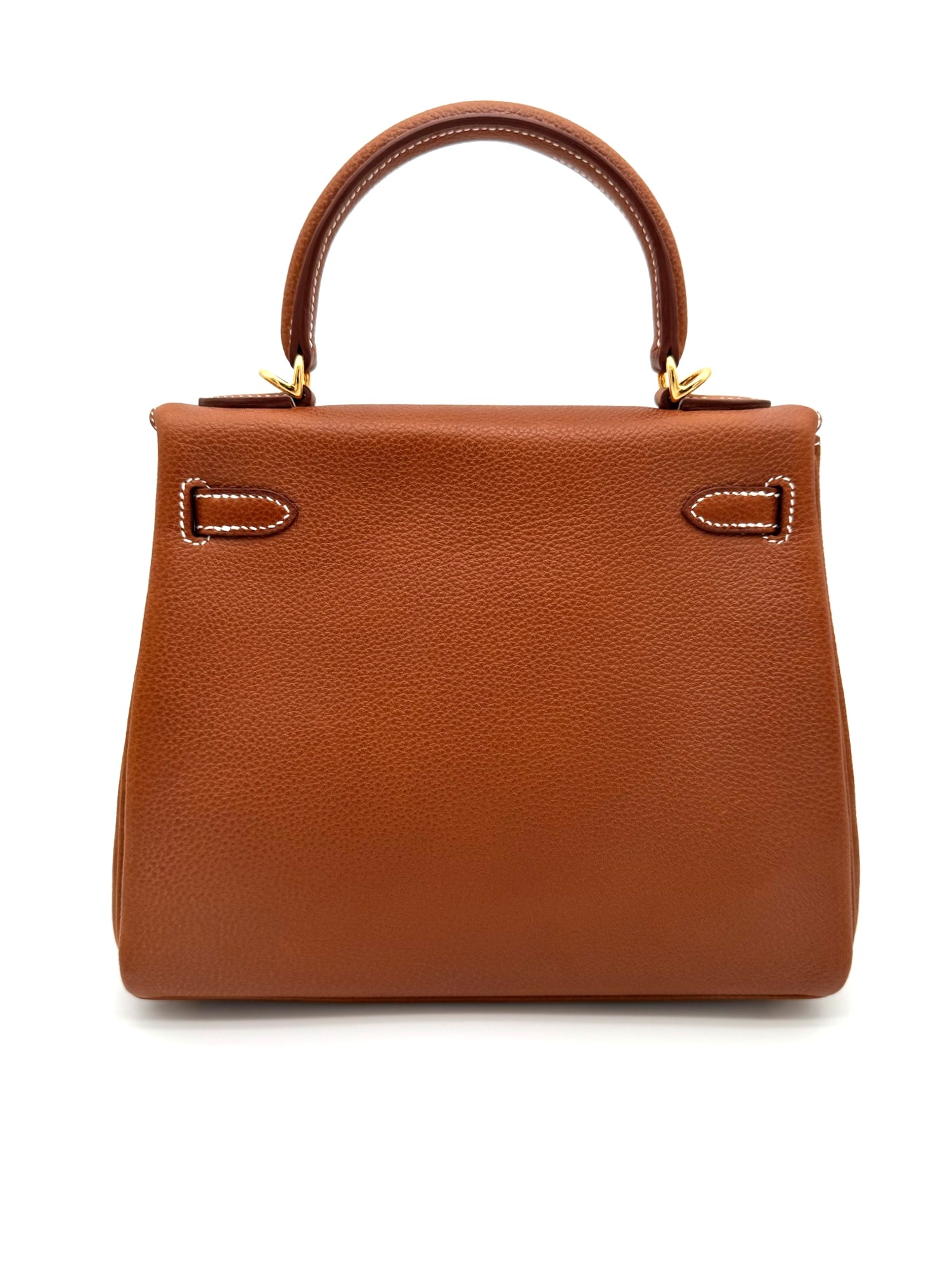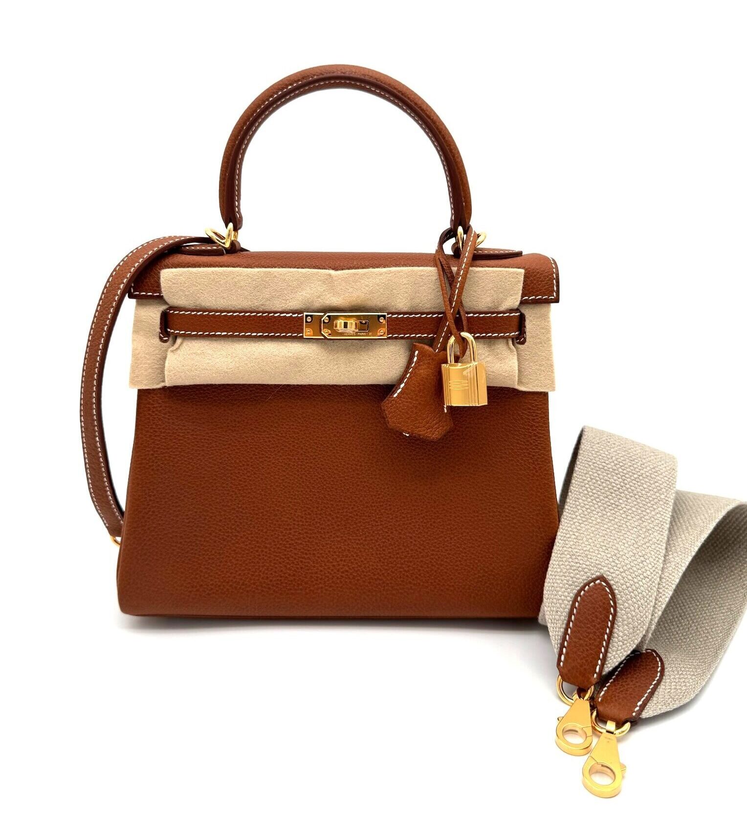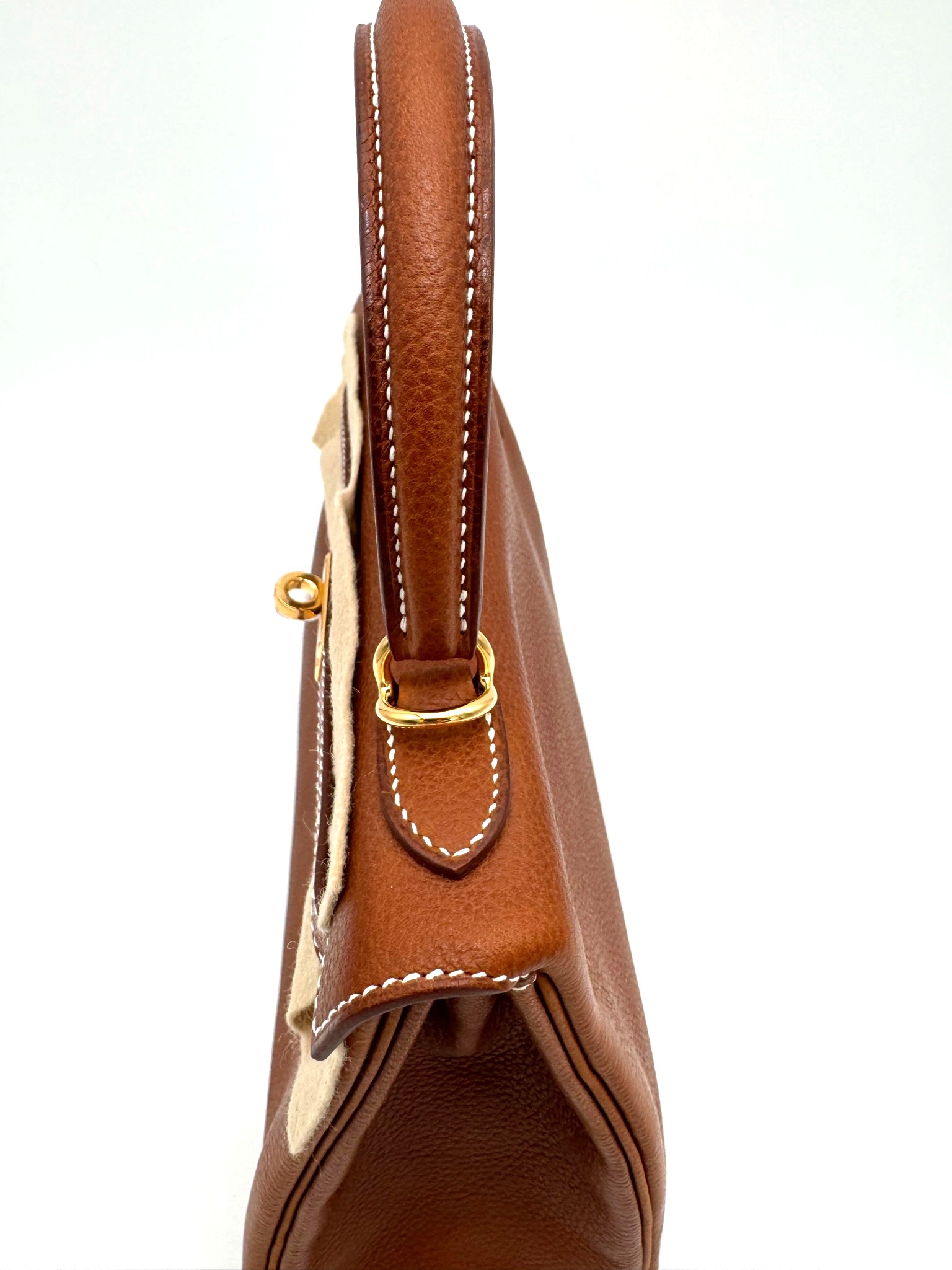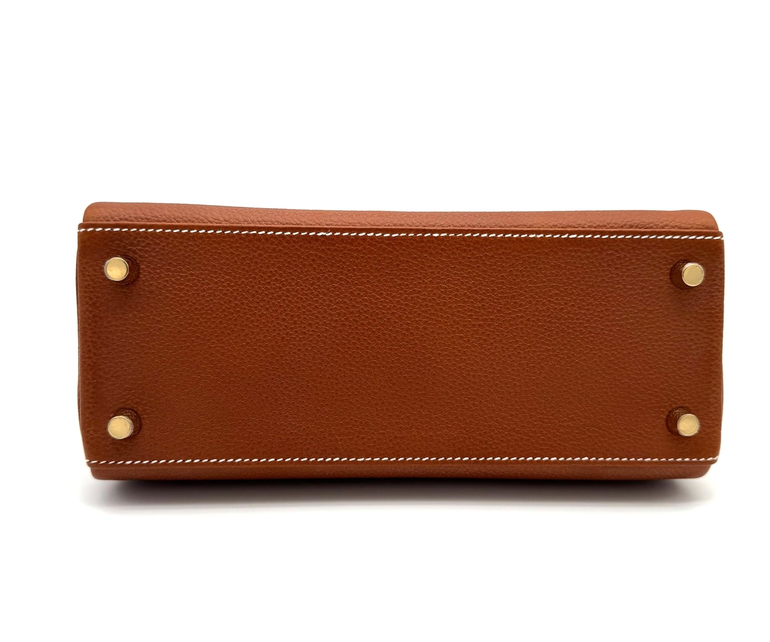 A classic Hermes bag that is beautifully handcrafted in Togo calfskin leather and features rolled leather top handles with yellow gold hardware. The bag opens to a goatskin leather interior with zipper and pockets.