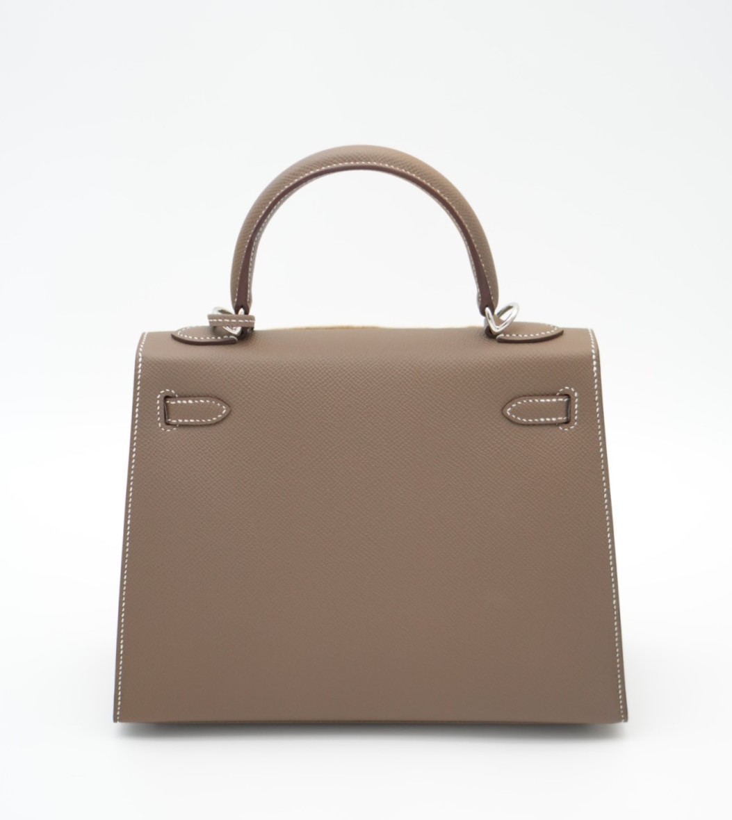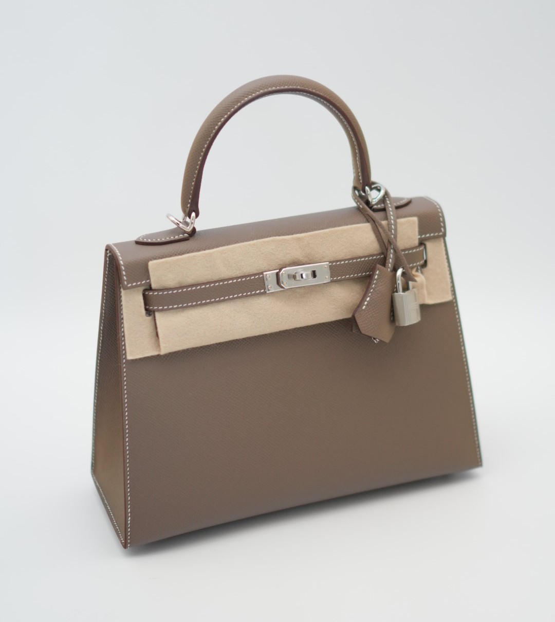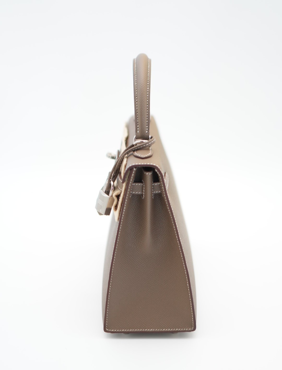 A classic Hermes bag that is beautifully handcrafted in Epsom calfskin leather and features a single rolled leather top handle with palladium hardware. It also has a removable leather shoulder strap. The bag opens to a goatskin leather interior with zipper and pockets.