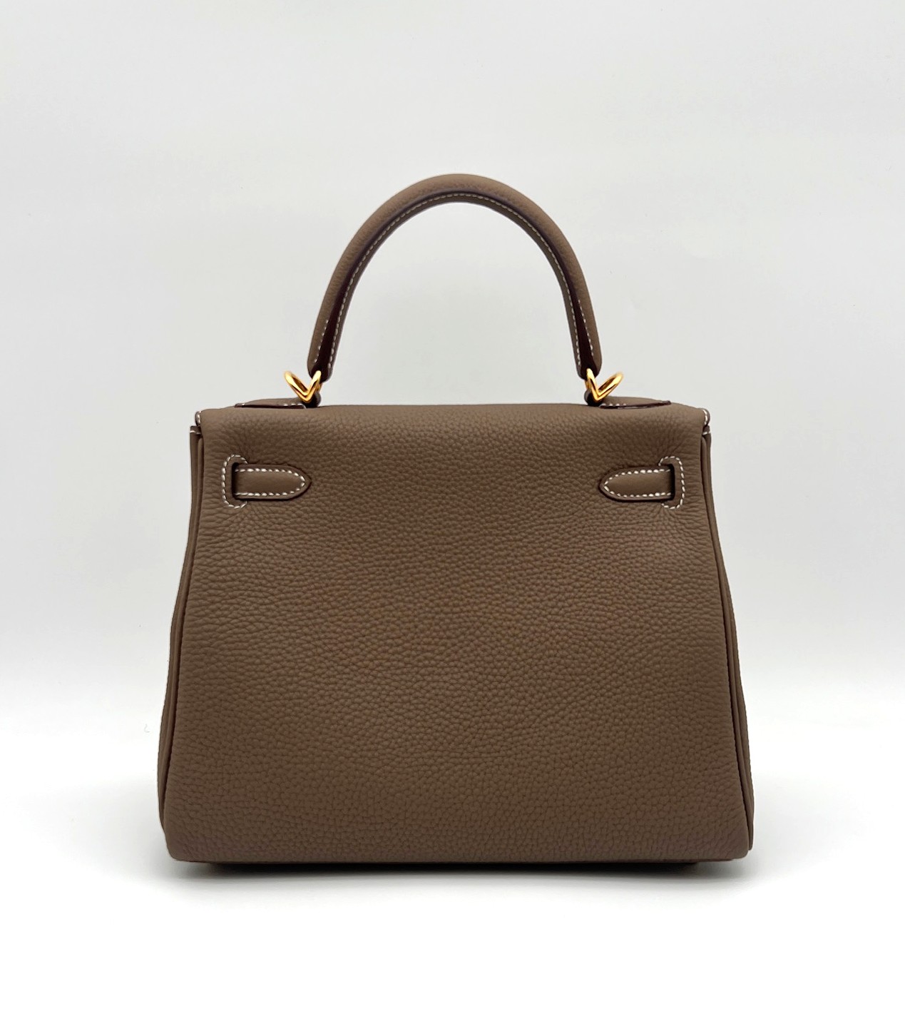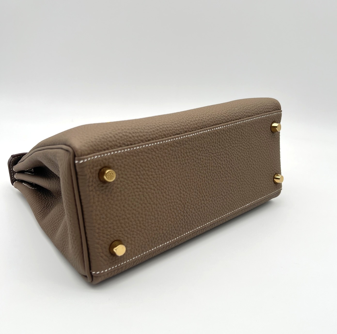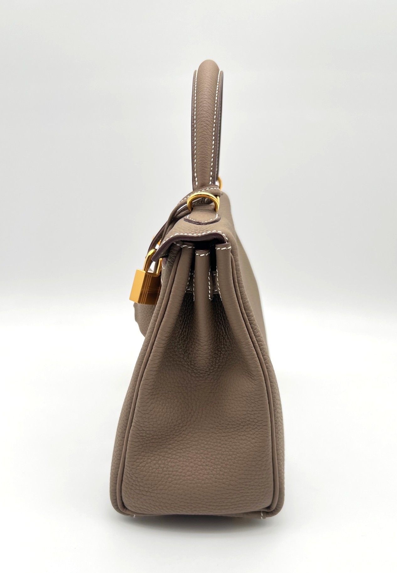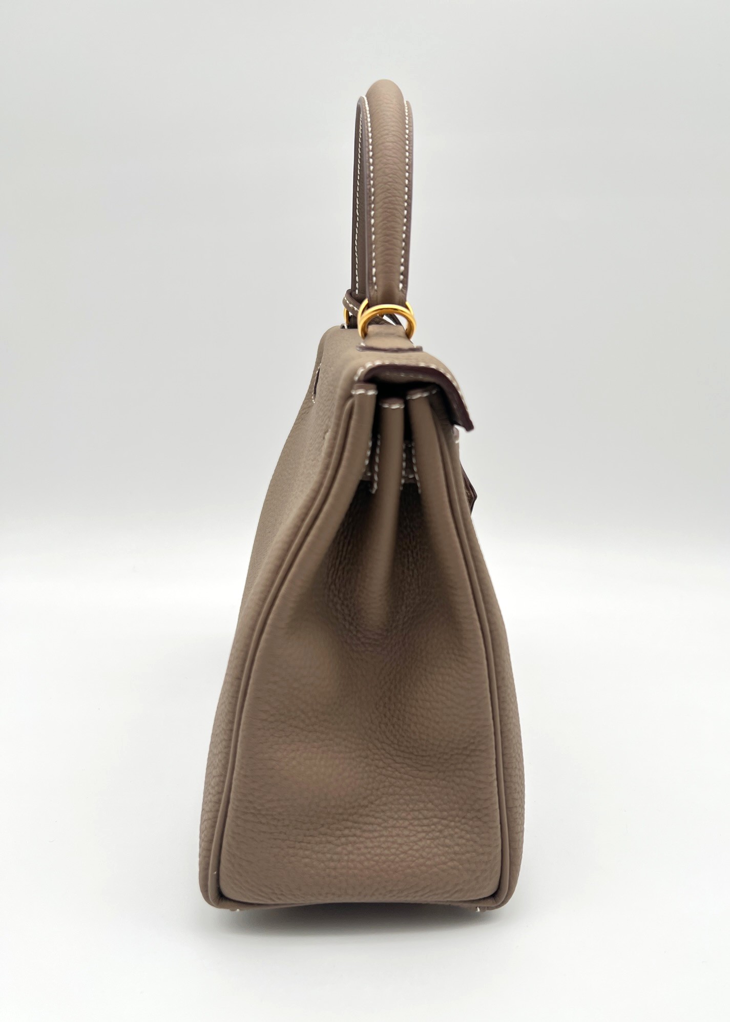 A classic Hermes bag that is beautifully handcrafted in Togo calfskin leather and features rolled leather top handles with yellow gold hardware. The bag opens to a goatskin leather interior with zipper and pockets.
