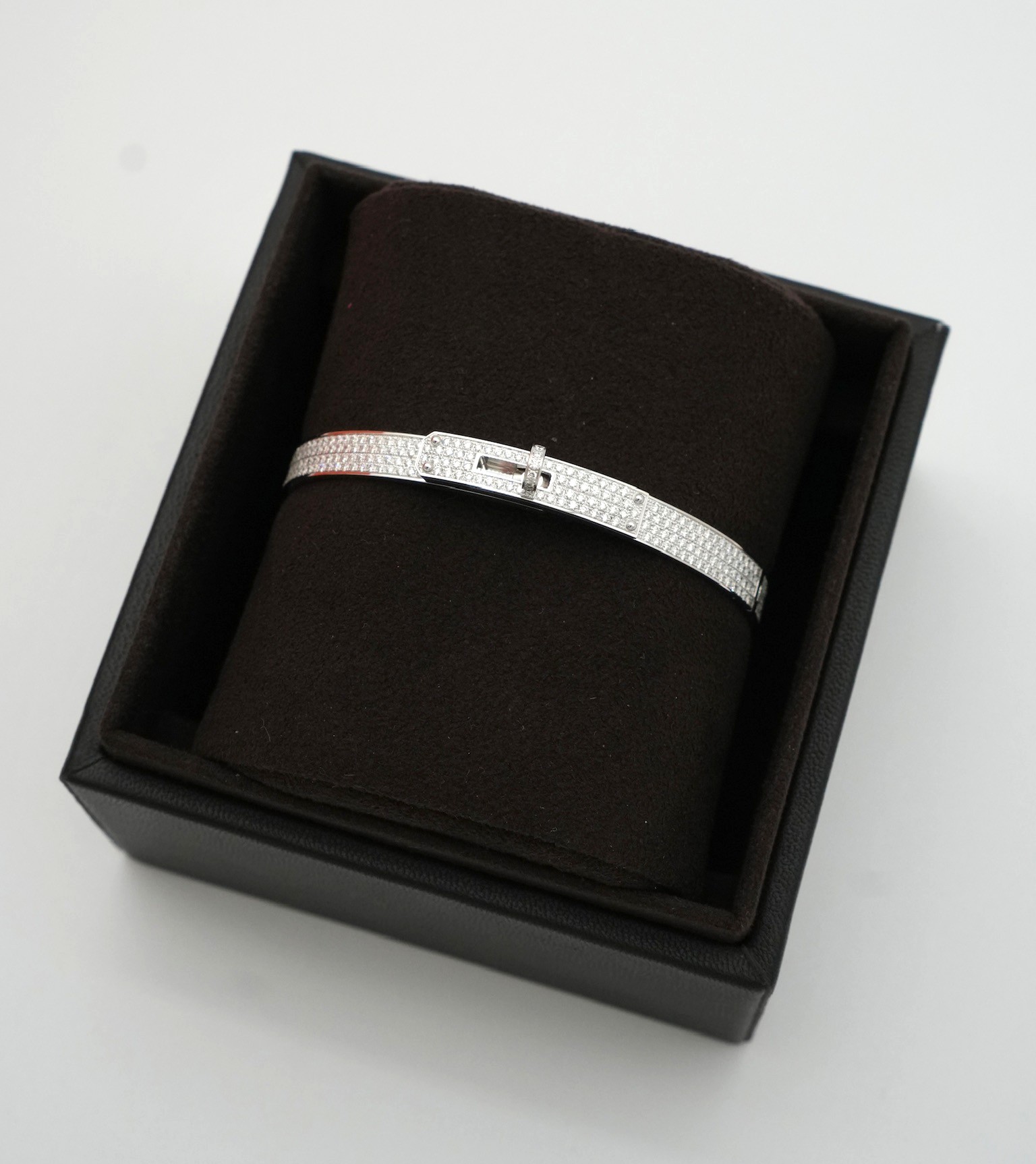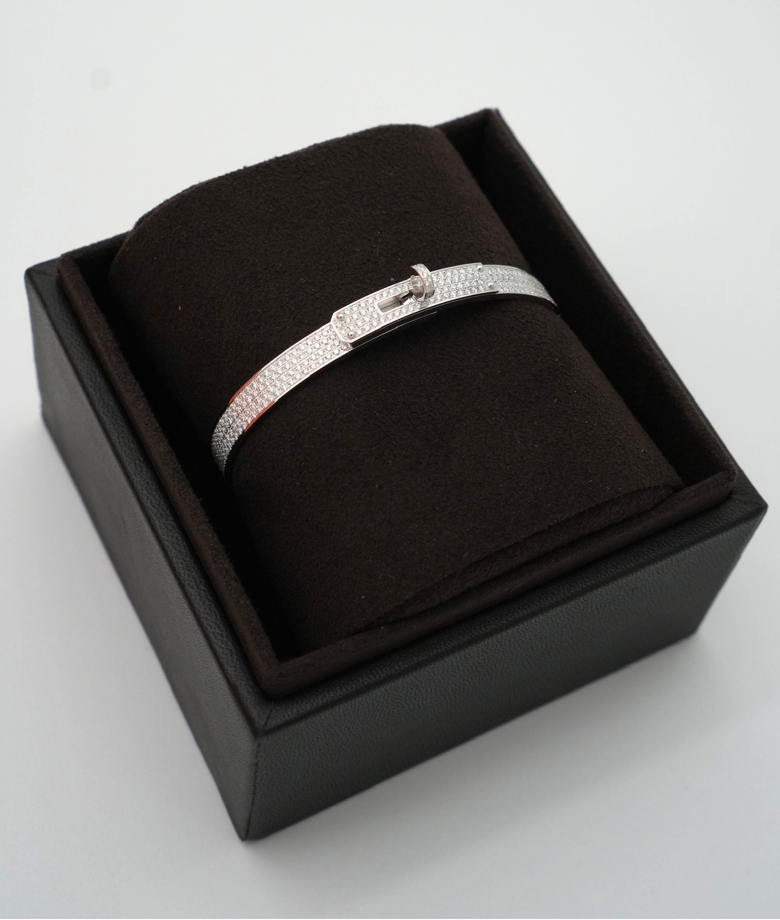 Elegant and timeless bracelet in white gold set with diamonds. Hermes iconic bag with its turn clasp reinvented as a signature piece of jewelry.