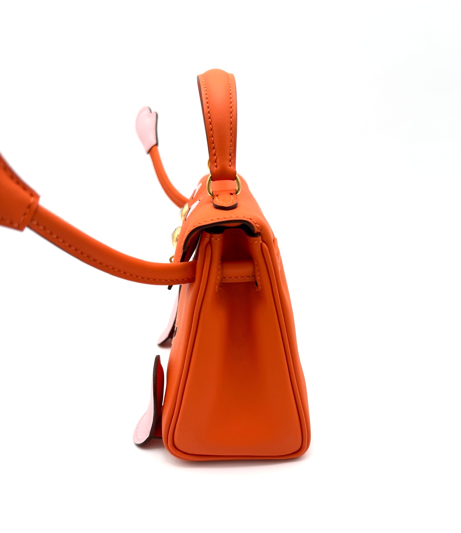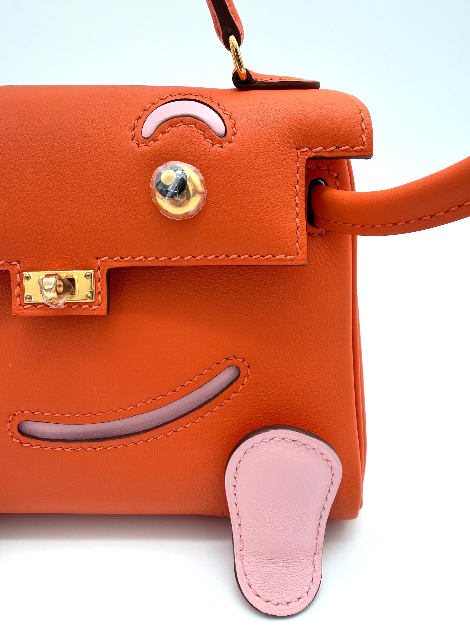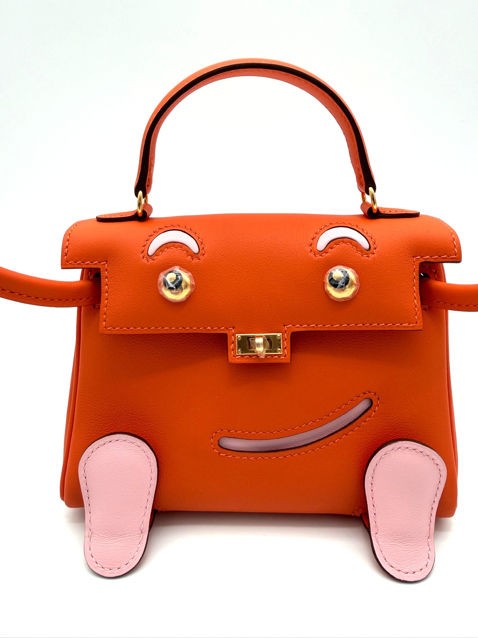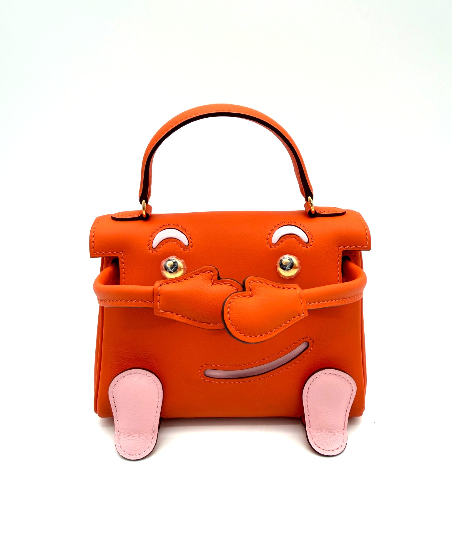 A whimsy, cute Hermes rare collectible bag that is beautifully handcrafted in Swift leather. It features a smiling face, movable arms and feet with yellow gold hardware.