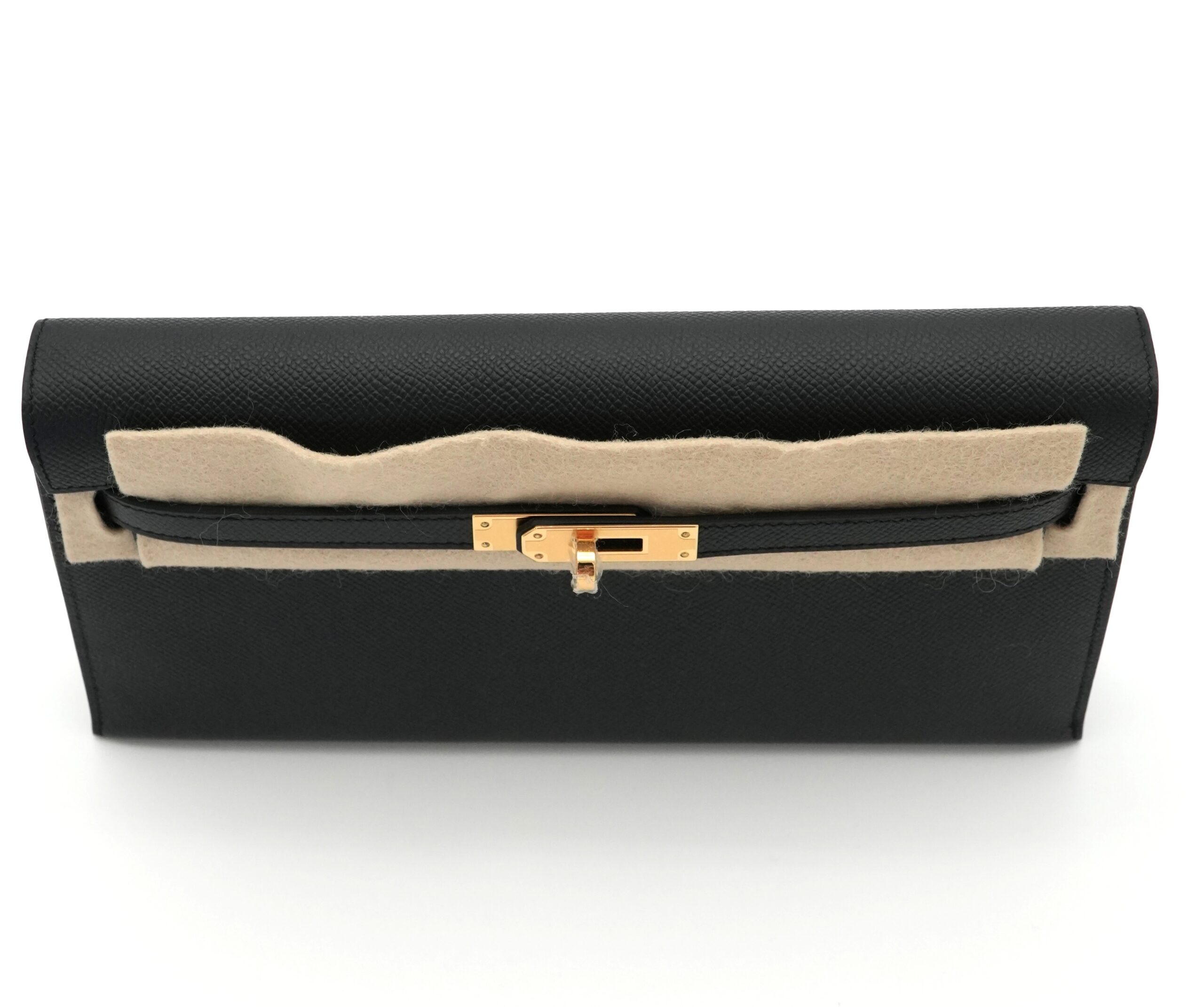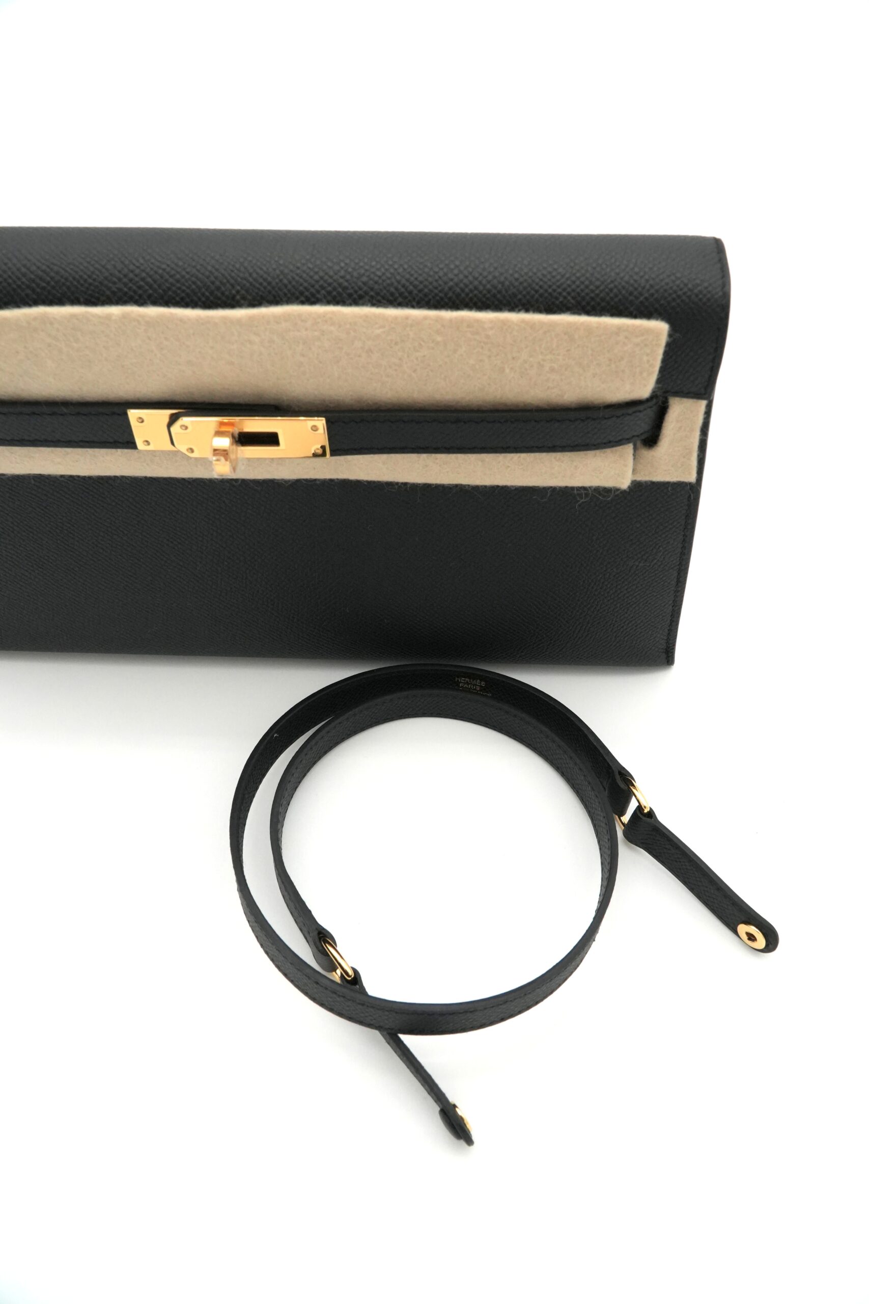 This chic and versatile bag is handcrafted of Epsom calfskin leather with the iconic Kelly strap closure. The strap is removeable, which can convert into a luxurious clutch. The bag opens to a matte leather interior with a patch pocket.