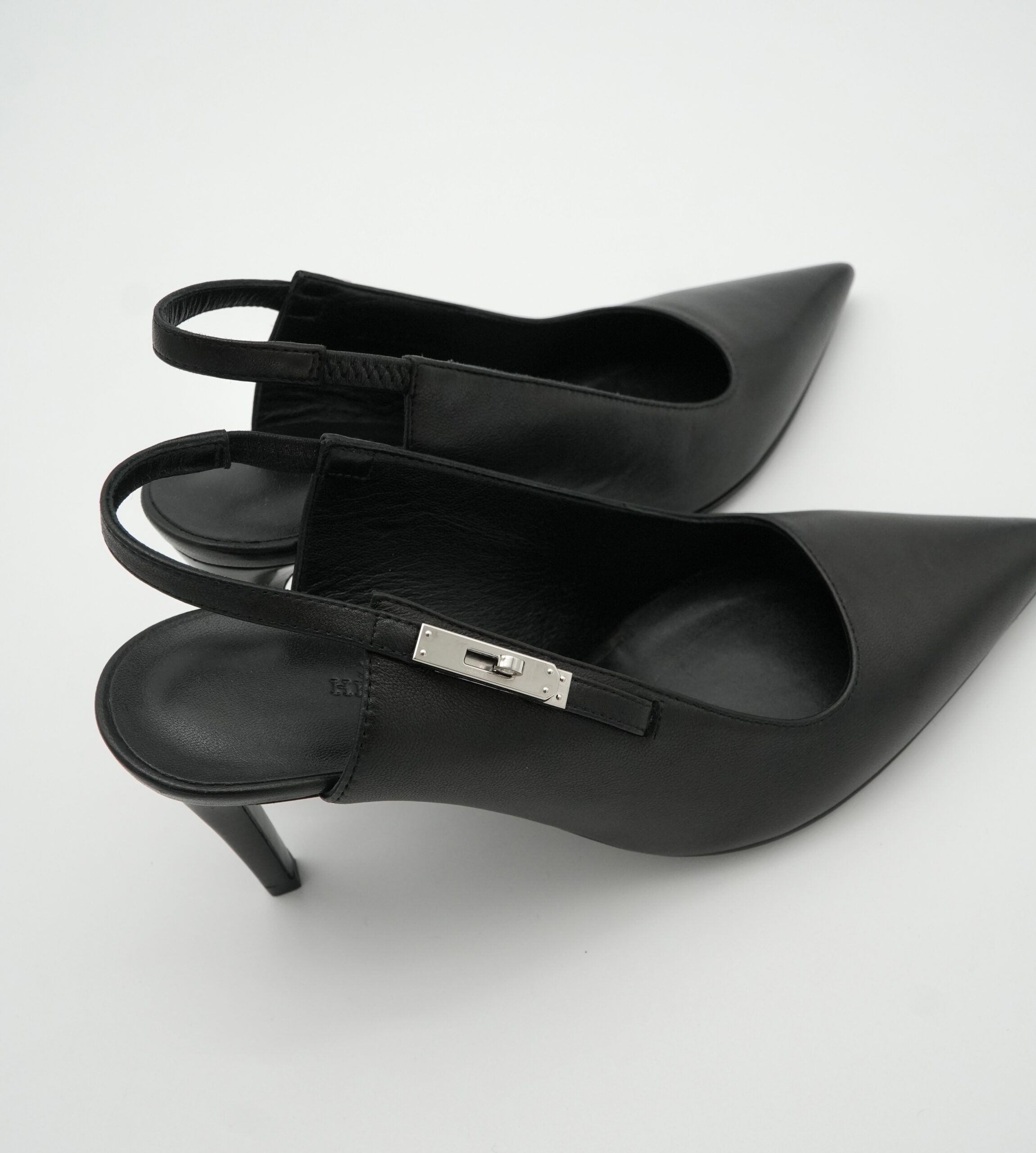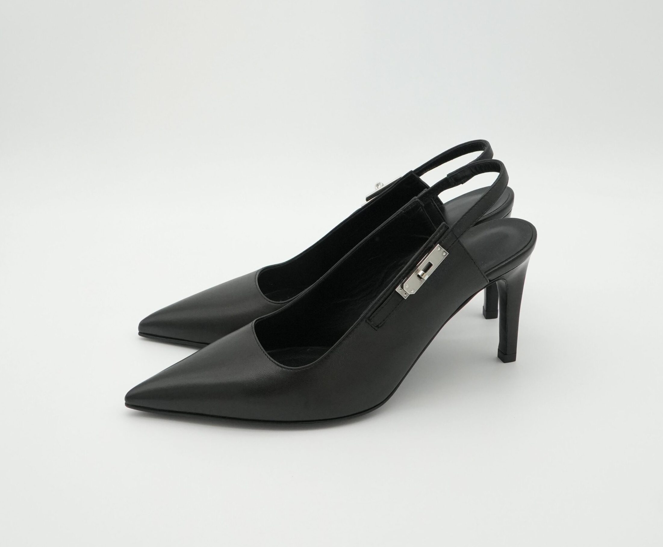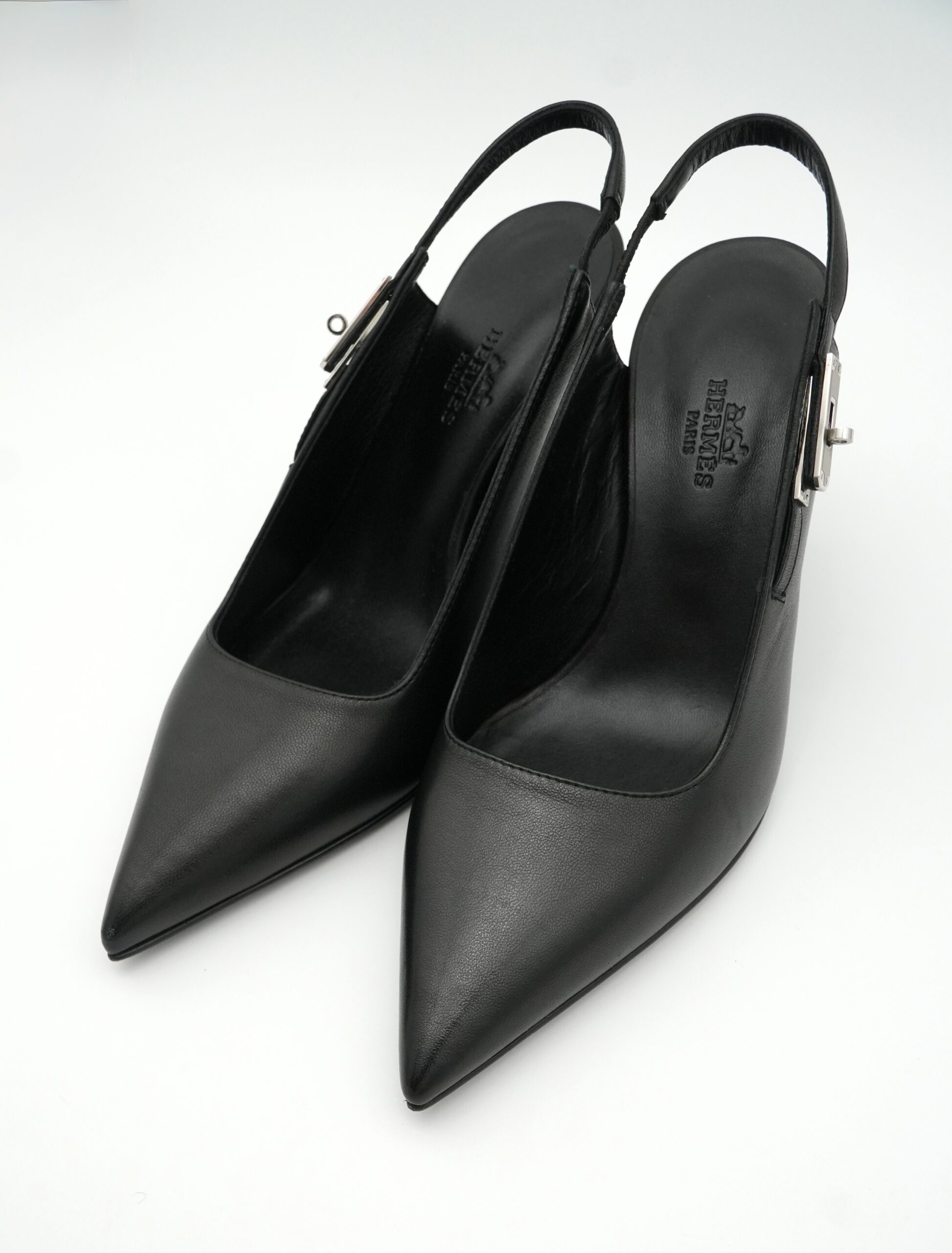 These fabulous black pumps are made of Nappa leather. They feature a pointed toe and the iconic Kelly buckle in palladium hardware. Add elegance to every wardrobe!