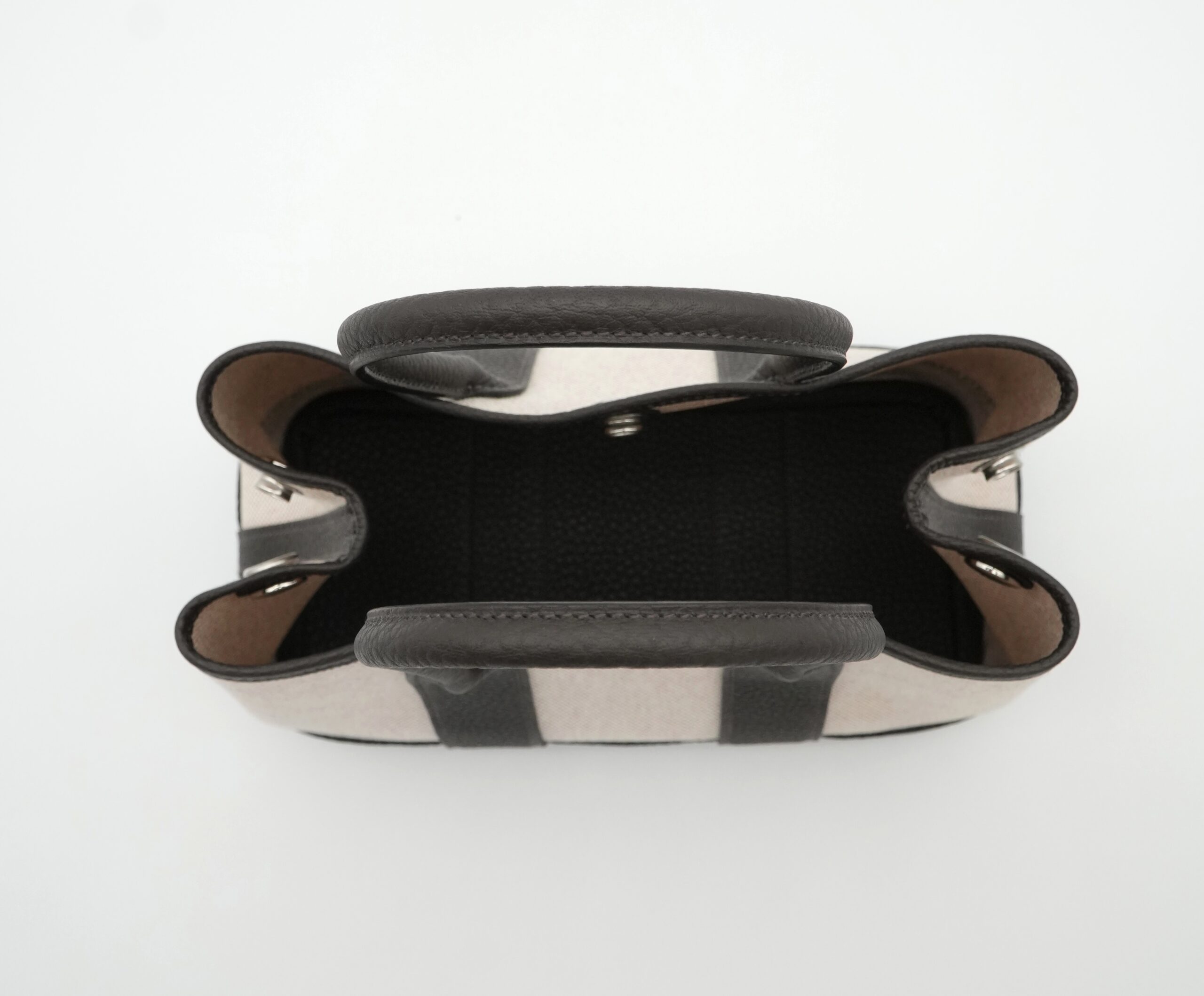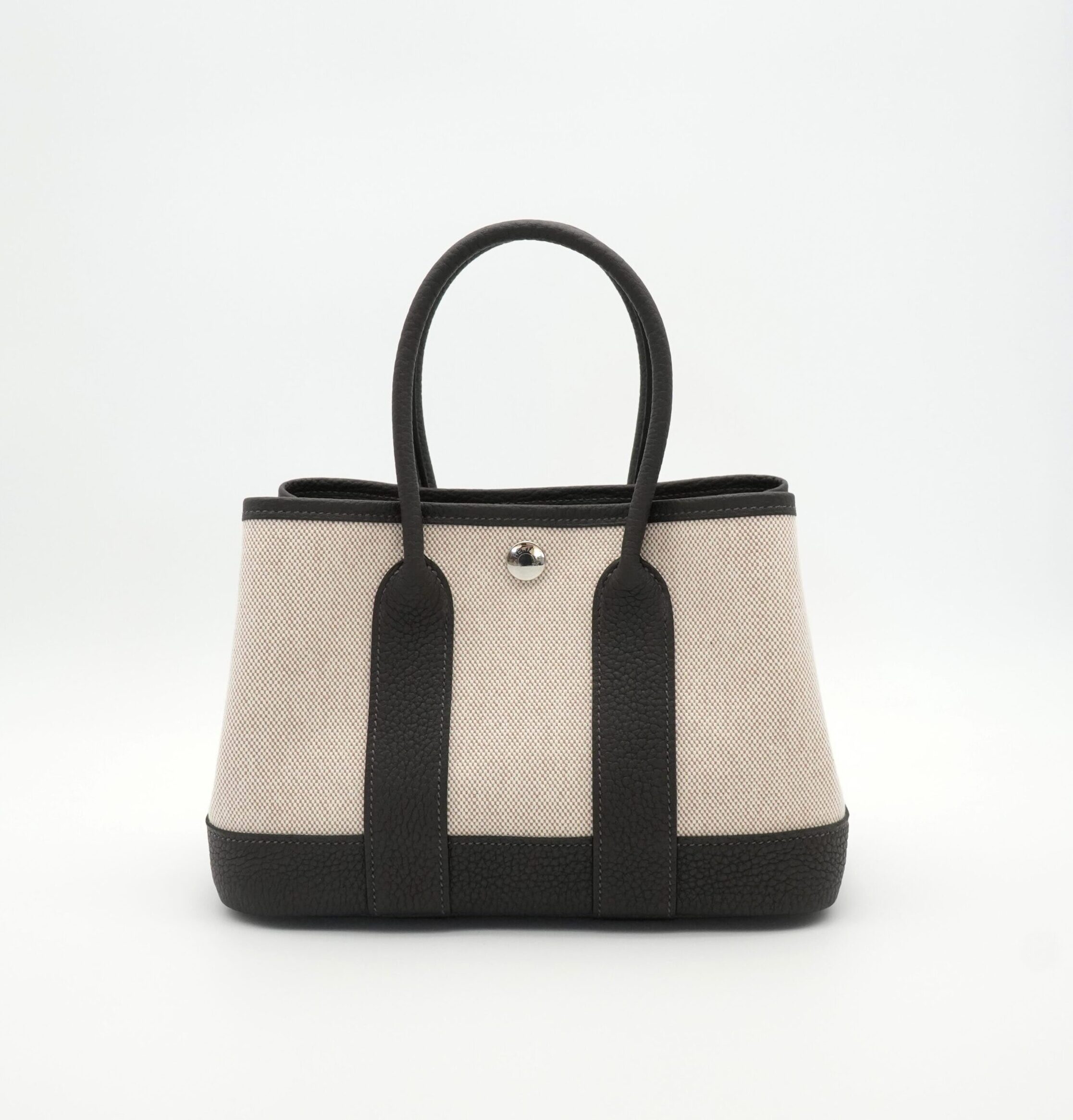 A versatile and functional, this adorable tote is the most popular size Garden Party. The tote features rolled leather top handles and expandable sides. The open top opens to a herringbone fabric interior with a zip pocket.