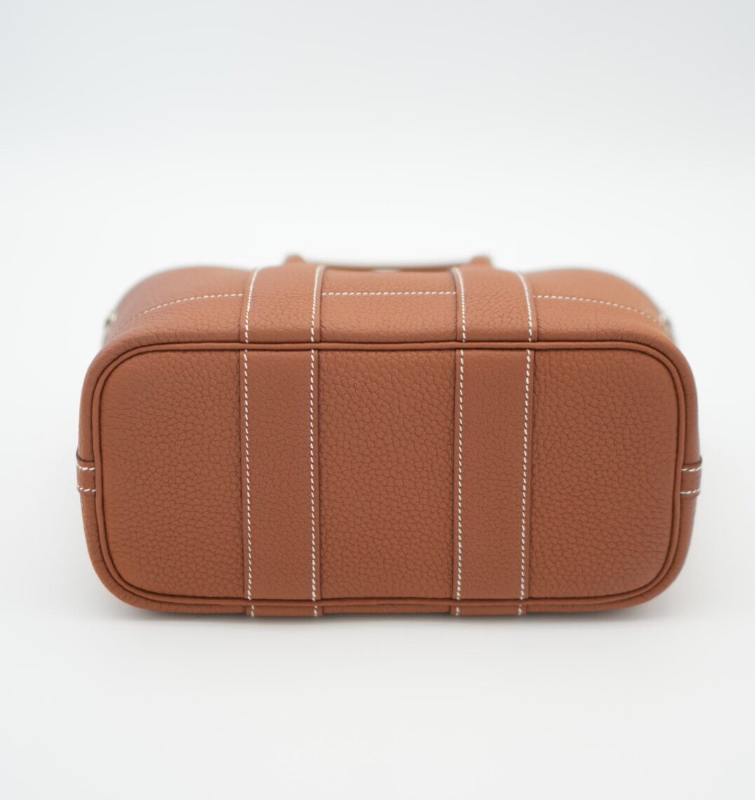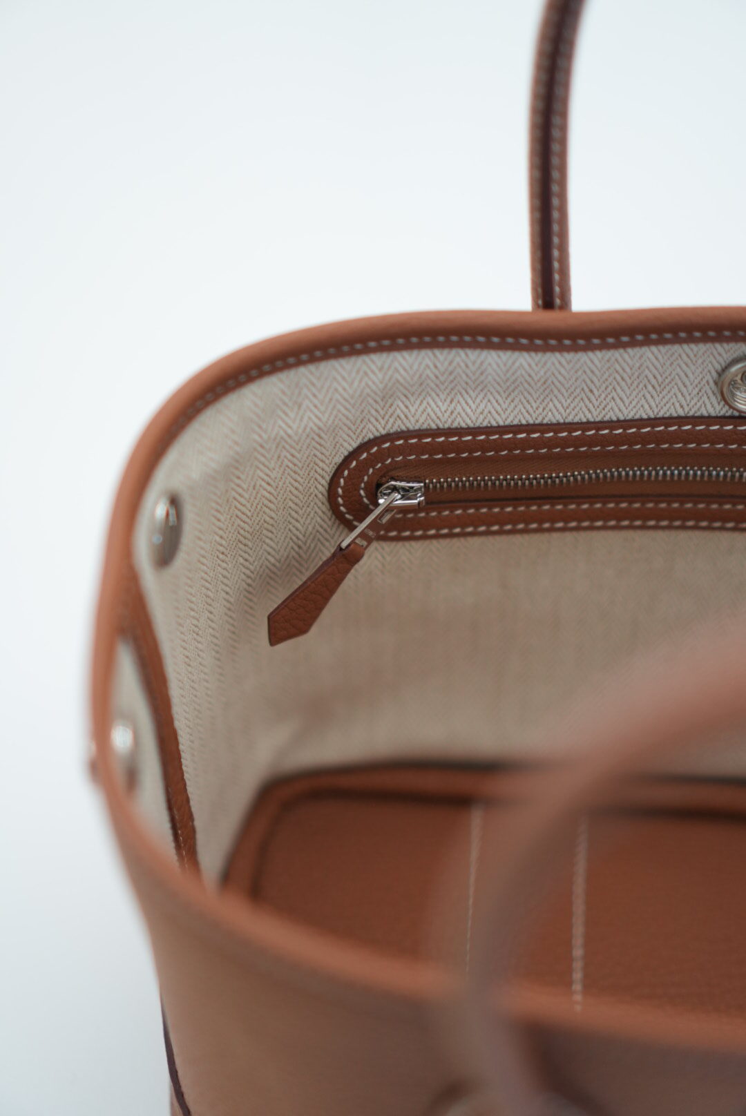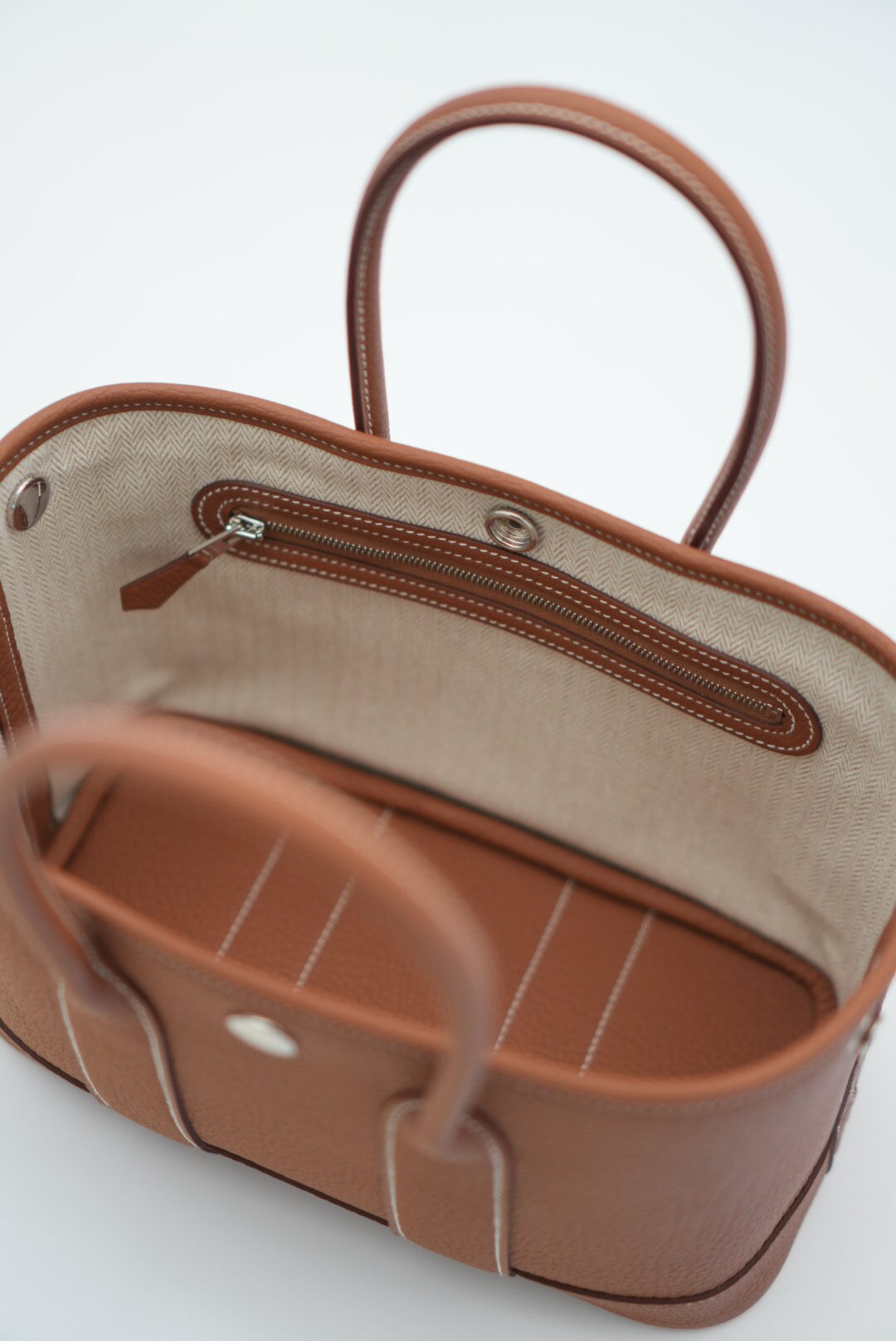 A versatile and functional, this adorable tote is the most popular size Garden Party.  The tote features rolled leather top handles and expandable sides.  The open top opens to a herringbone fabric interior with a zip pocket.