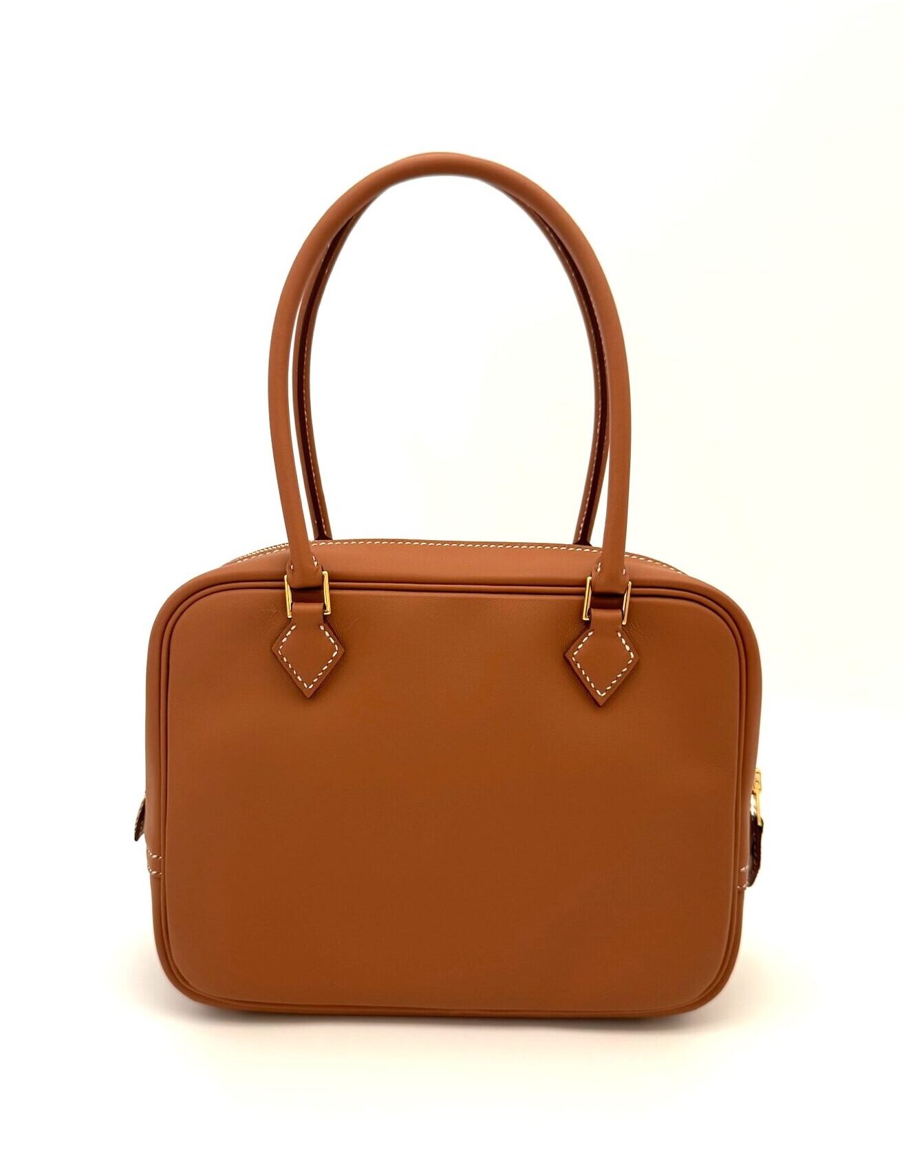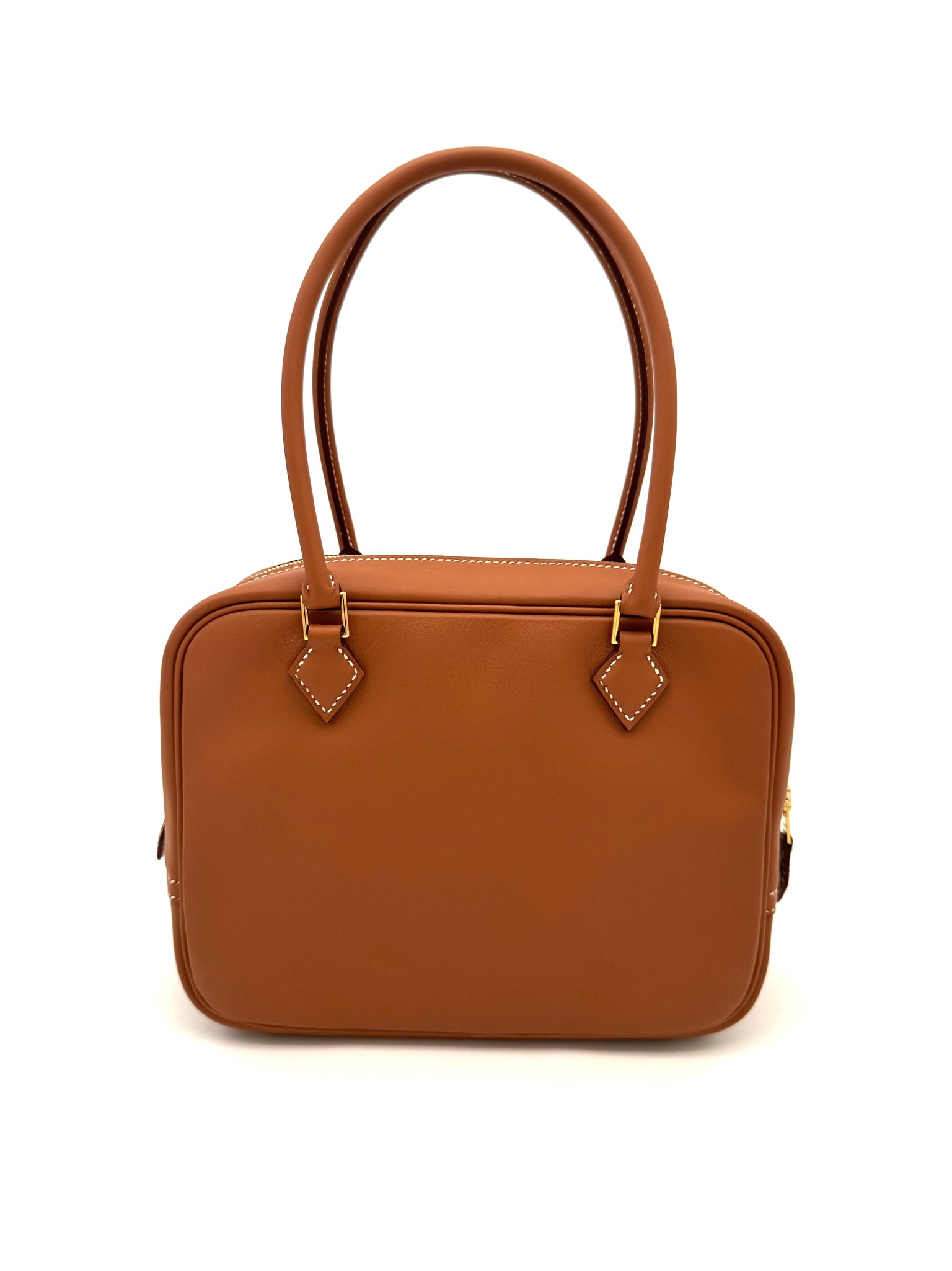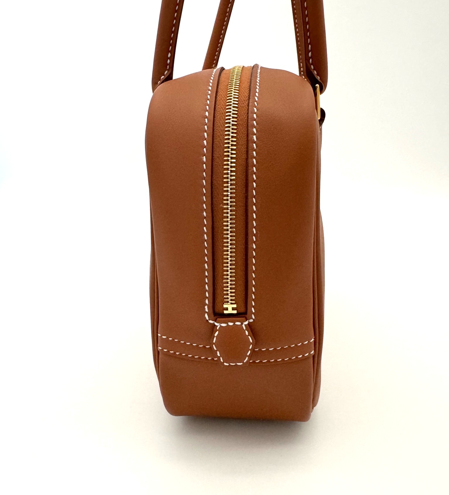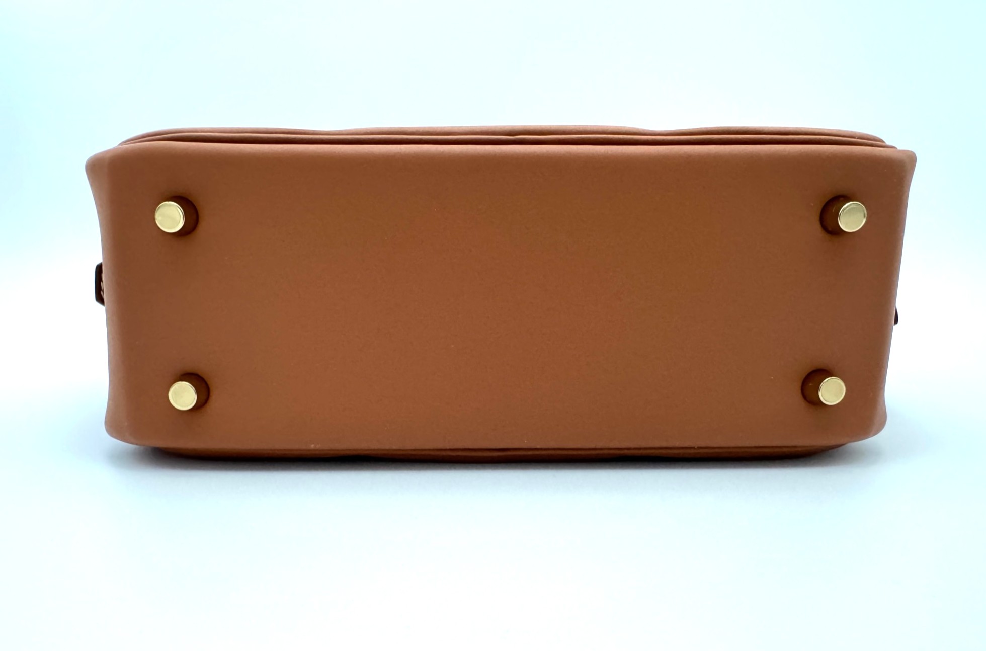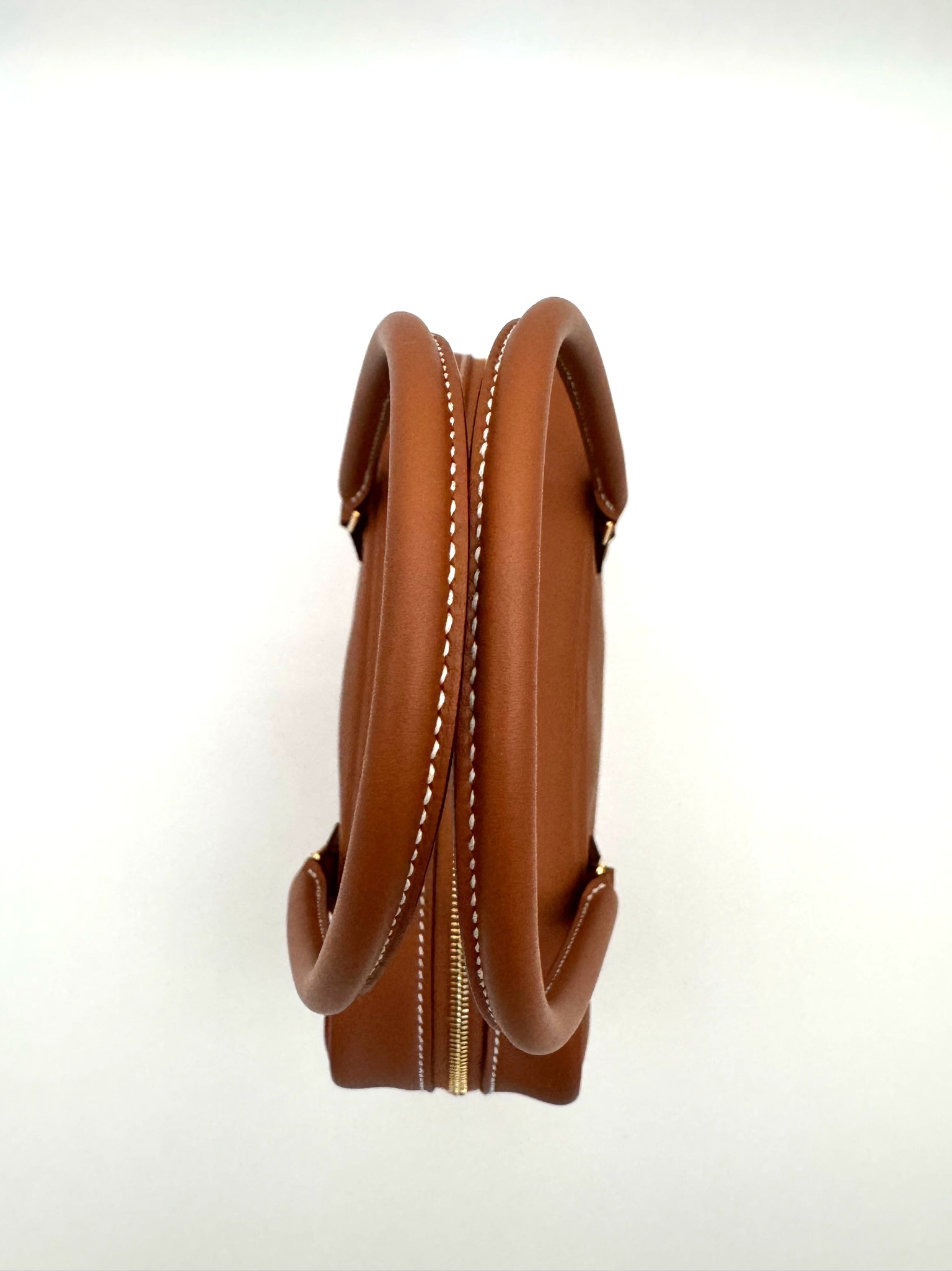 A practical and low-profile style bag, it features a clean rectangular shape with dual top handles and smooth leather finish. The bag opens to a goatskin leather interior.