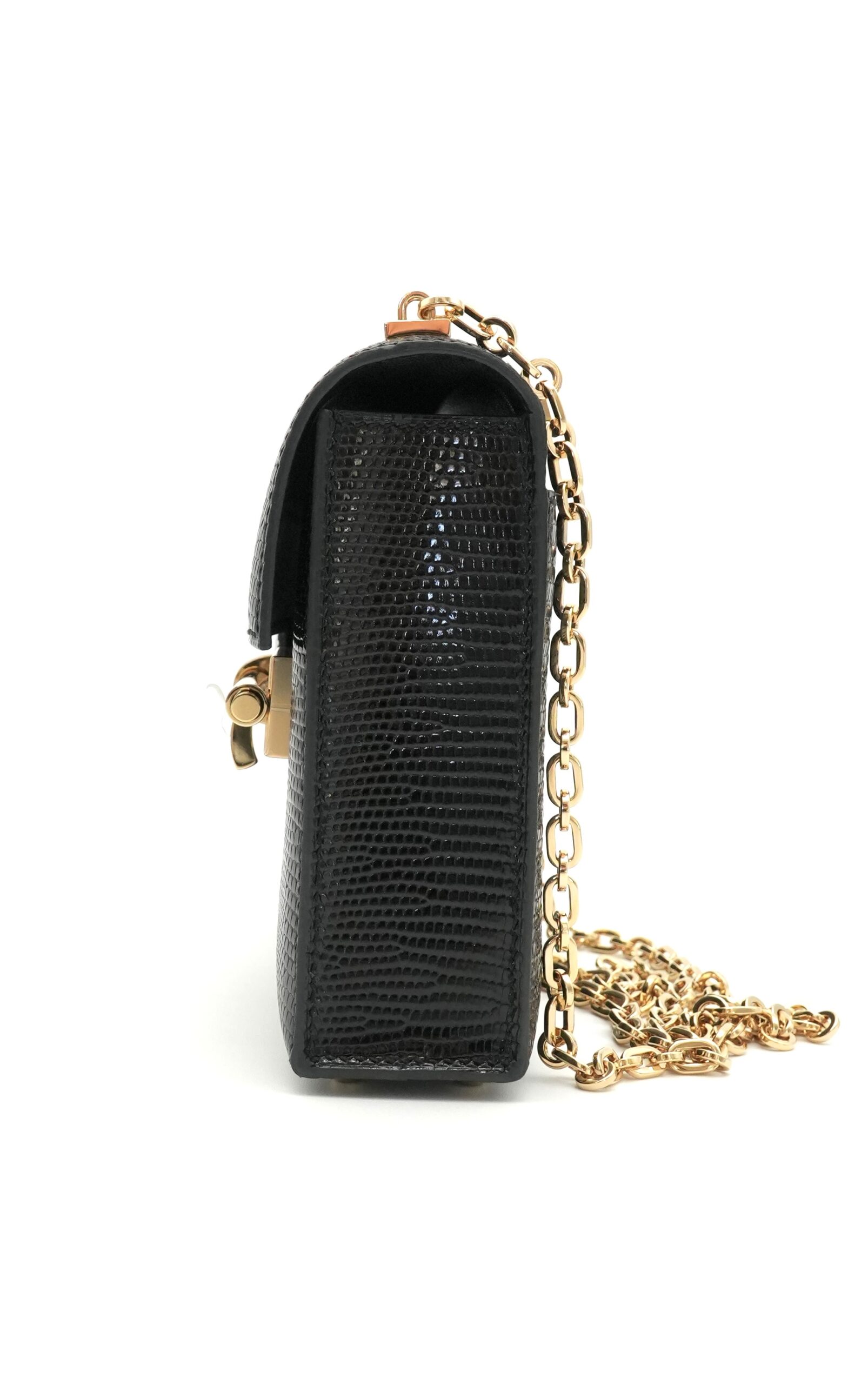 This structured, stylish bag is handcrafted of shiny Lizard leather. The bag features a latch lock and chain strap. It opens to a compact, Swift leather interior with two flat pockets.